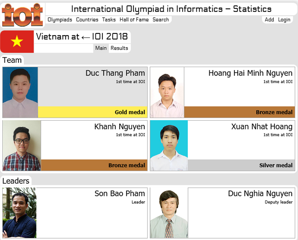 Kỳ thi Olympic Tin học quốc tế (IOI) năm 2018 diễn ra tại Tsukuba, Nhật Bản từ ngày 1-7/9/2018. Được biết, 4/4 thành viên của đoàn Việt Nam đều giành huy chương với 1 huy chương Vàng, 1 huy chương Bạc và 2 huy chương Đồng.