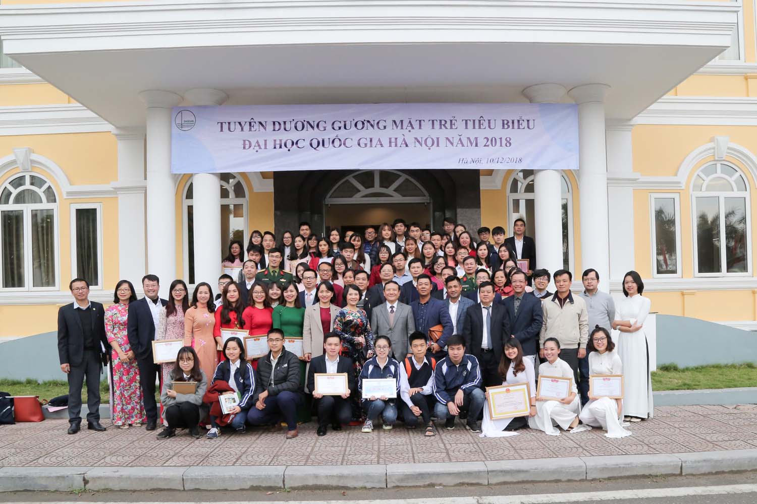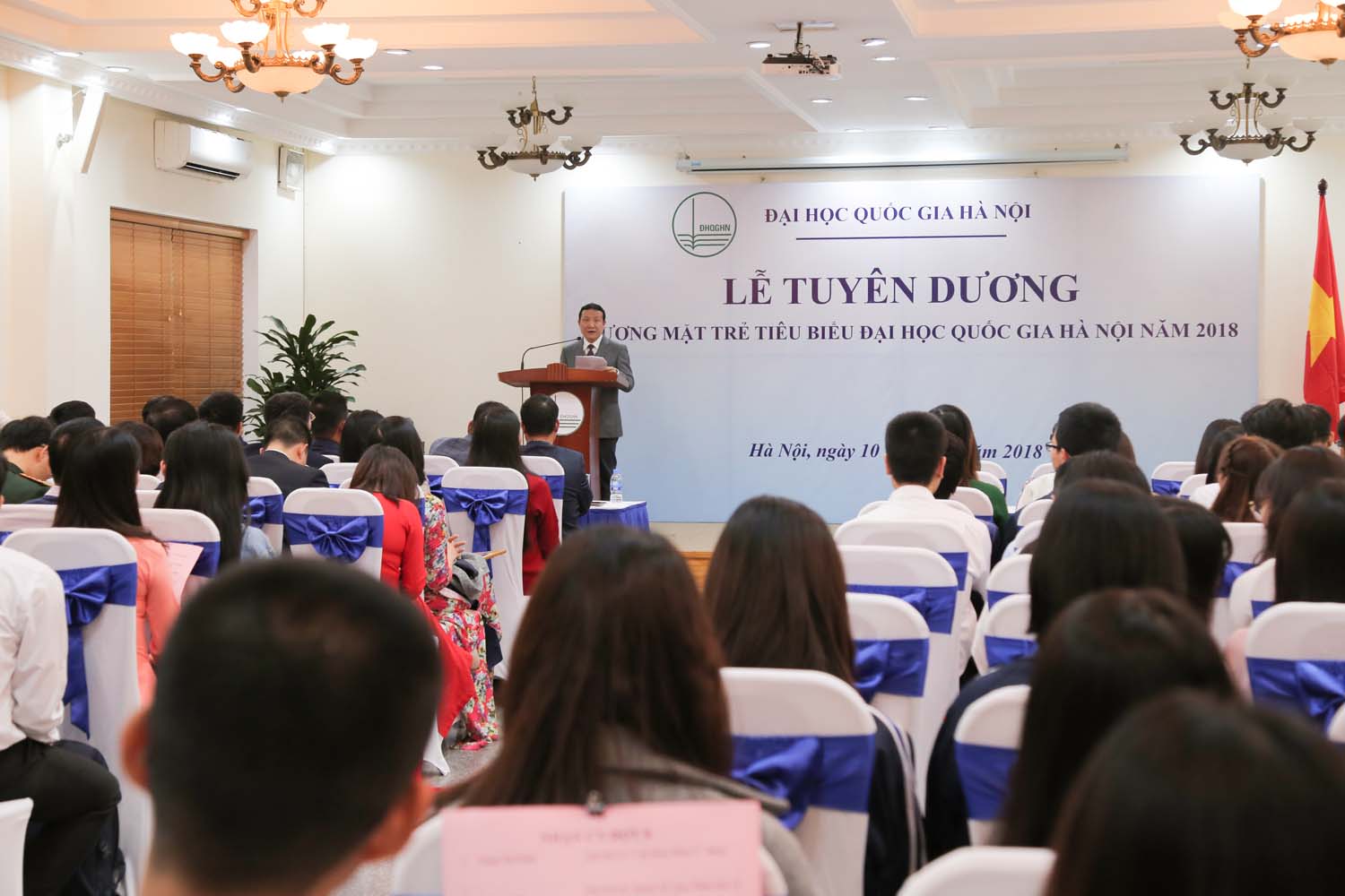 Tại buổi lễ, Phó Giám đốc ĐHQGHN Nguyễn Hồng Sơn ghi nhận và biểu dương những thành quả mà thế hệ trẻ ĐHQGHN đã đạt được trong năm 2018 ở tất cả các mảng hoạt động: học tập, nghiên cứu, giảng dạy và công tác. Phó Giám đốc chúc mừng 74 cá nhân đã vinh dự được nhận danh hiệu “Gương mặt trẻ tiêu biểu cấp ĐHQGHN năm 2018”. Trong số này có 06 học sinh – sinh viên đoạt giải cao trong các kỳ thi quốc gia, quốc tế; 48 học sinh – sinh viên, học viên cao học, nghiên cứu sinh đạt thành tích xuất sắc trong học tập và 20 cán bộ trẻ đạt thành tích xuất sắc trong công tác.
