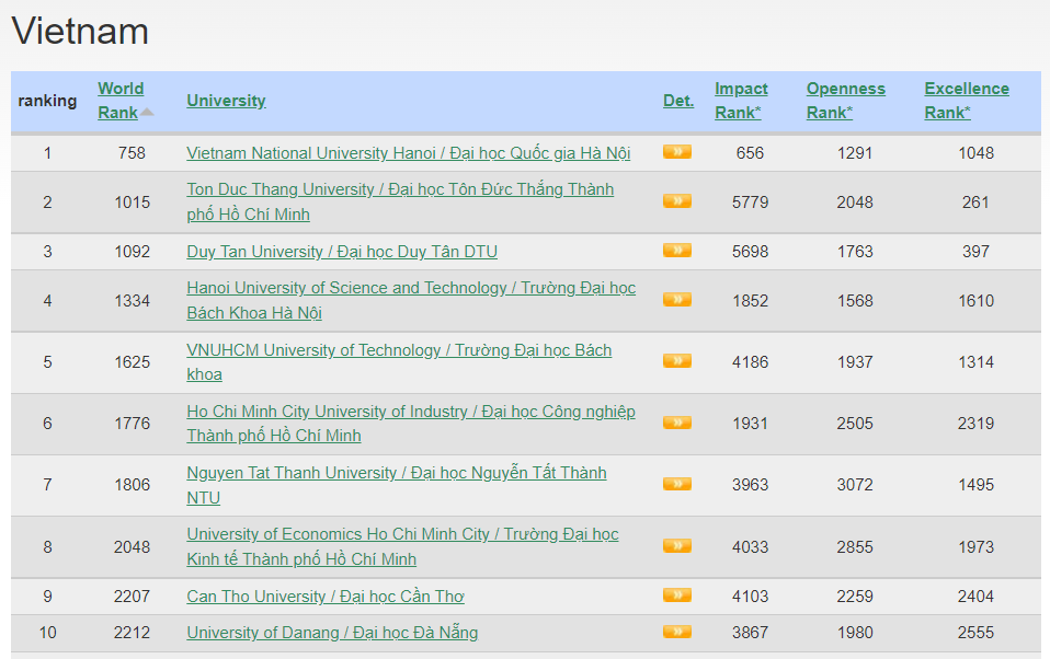 Tốp 10 cơ sở giáo dục đại học của Việt Nam trong bảng xếp hạng Webometrics tháng 8/2022 (Nguồn: https://www.webometrics.info/en/Asia/Vietnam)