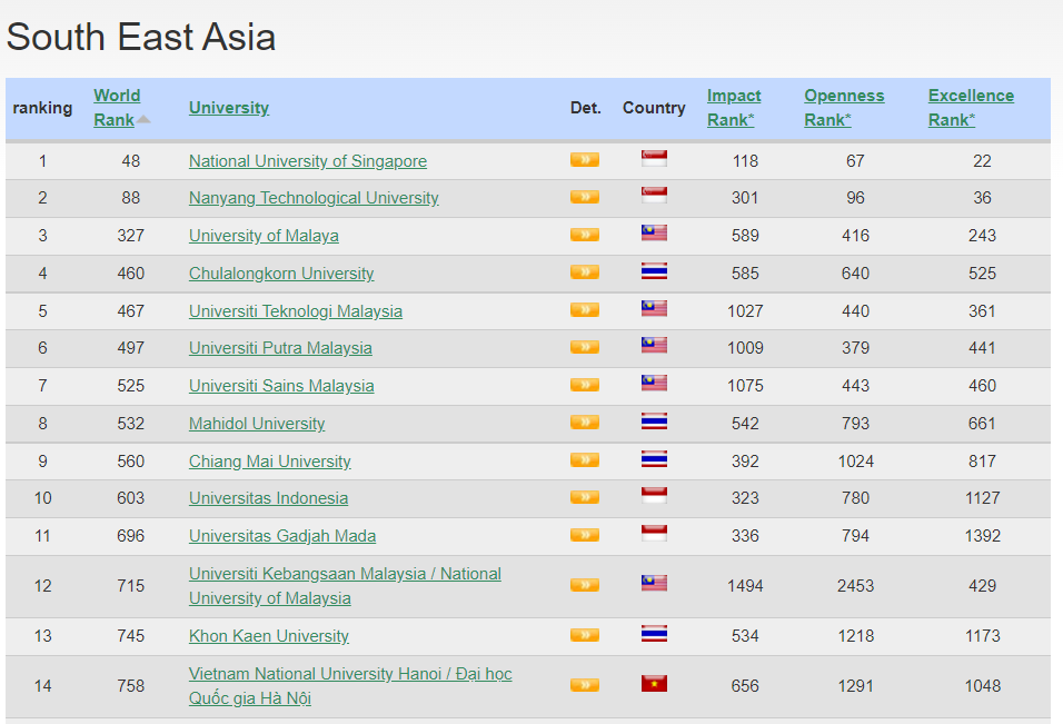 Vị trí xếp hạng của ĐHQGHN trên BXH Webometrics tháng 8/2022 trong khu vực Đông Nam Á (Nguồn: https://www.webometrics.info/en/Asia_Pacifico/South%20East%20Asia)