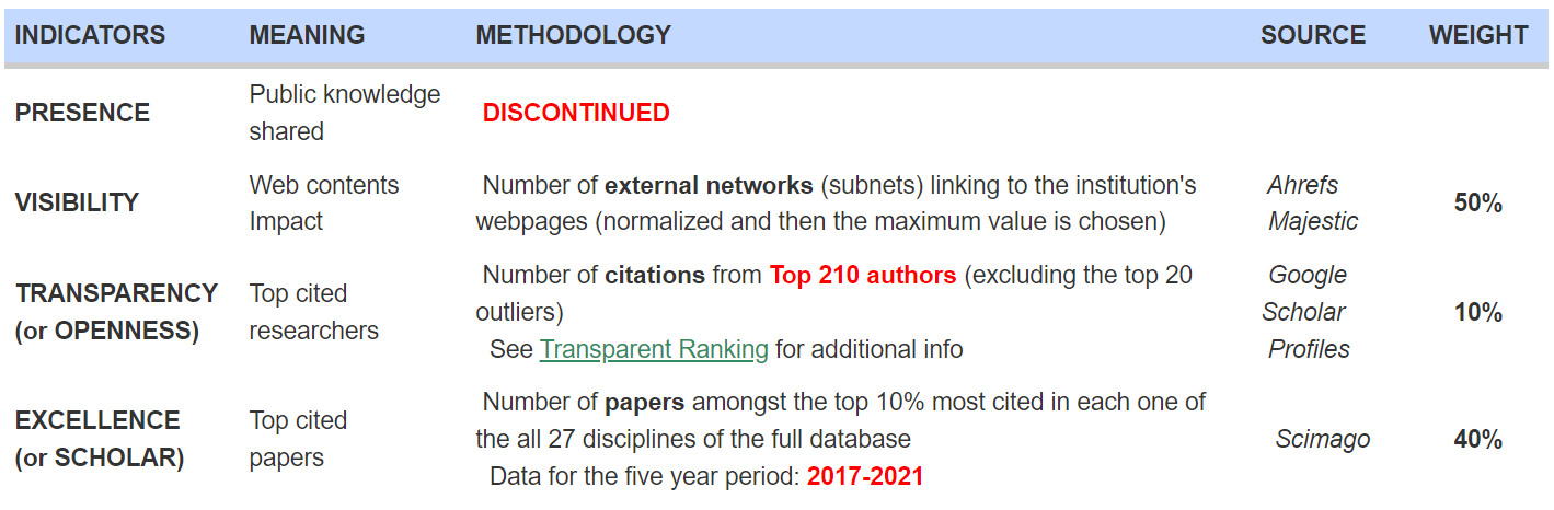 Trong kỳ xếp hạng này, Webometrics vẫn duy trì phương pháp xếp hạng như ở kỳ tháng 01/2021. Cụ thể, tiêu chí “Presence” (Lượng tài nguyên số hóa) đã được loại bỏ trong phương pháp xếp hạng, tiêu chí Visibility (Mức độ ảnh hưởng) có trọng số cao nhất (50%), tiếp theo là tiêu chí Excellence (Sự xuất sắc) có trọng số 40% và tiêu chí Transperency (Độ mở học thuật) có trọng số 10%.