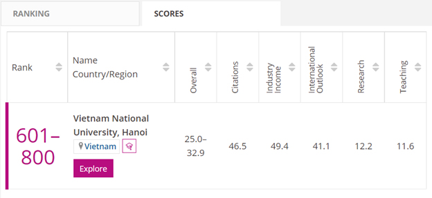 Ngày 18/9/2021, Times Higher Education công bố kết quả xếp hạng của các trường đại học thế giới theo lĩnh vực năm 2022 (Times Higher Education World University Rankings by subject – THE WUR by Subject) của 4 trong tổng số 11 lĩnh vực xếp hạng. Trong đó, ĐHQGHN duy trì vị trí trong top 601-800 của lĩnh vực Khoa học cơ bản (Physical Sciences) so với THE WUR by Subject 2021. Ba lĩnh vực khác cũng đã công bố kết quả bao gồm Clinical and Health, Life sciences và Psychology.