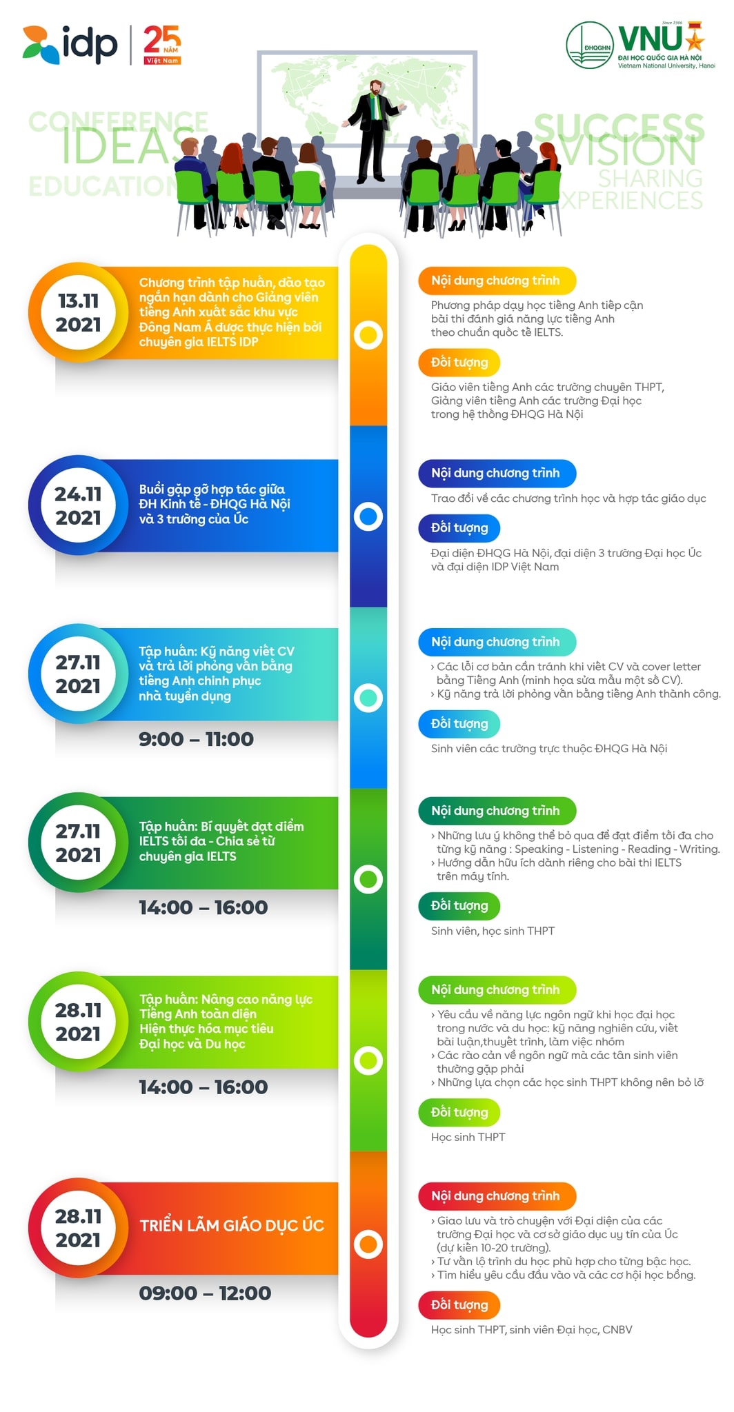 Với mục đích cung cấp thông tin về các kĩ năng Tiếng Anh cần thiết, hiểu rõ về kì thi IELTS cũng như tìm hiểu các chương trình học tại Úc, chuỗi sự kiện hứa hẹn sẽ mang đến nhiều trải nghiệm thiết thực dành cho các đối tượng khác nhau.