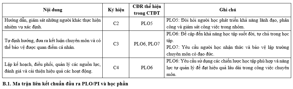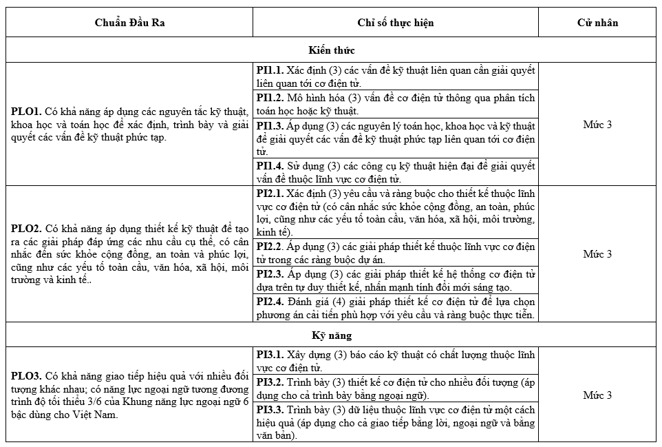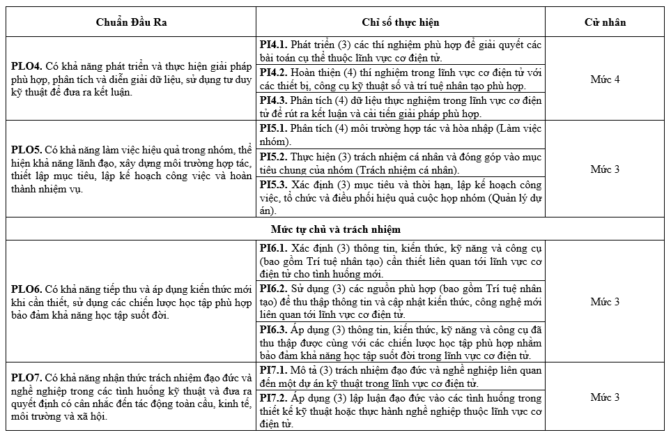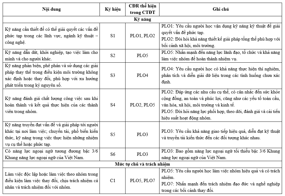 Các Chuẩn đầu ra (CĐR) của Chương trình đào tạo (CTĐT) bao gồm CĐR kiến thức, CĐR kỹ năng và CĐR mức tự chủ và trách nhiệm. CĐR bao gồm các mục (1) đến (7) như sau: