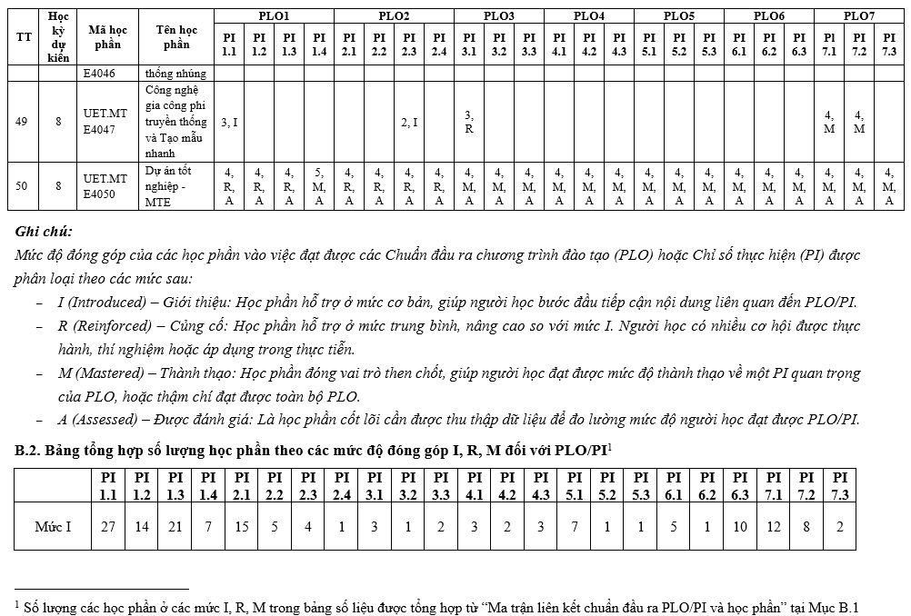 | Mã PLO | Nội dung chuẩn đầu ra | Đối sánh với mục tiêu đào tạo cụ thể | ||