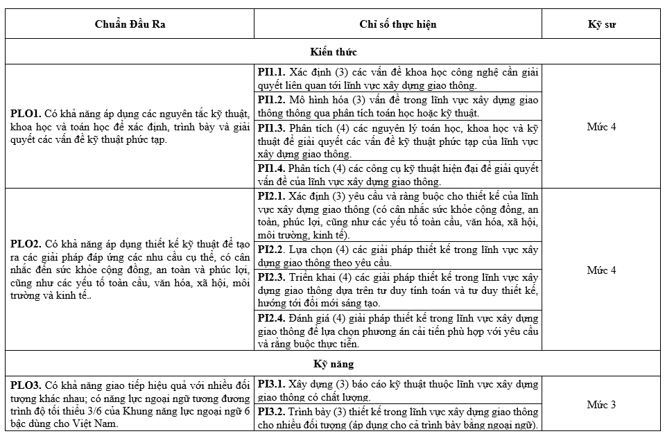 Các Chuẩn đầu ra (CĐR) của Chương trình đào tạo (CTĐT) bao gồm CĐR kiến thức, CĐR kỹ năng và CĐR mức tự chủ và trách nhiệm. CĐR bao gồm các mục (1) đến (7) như sau: