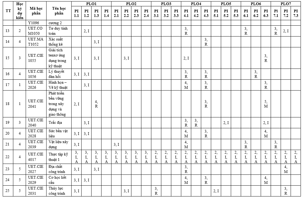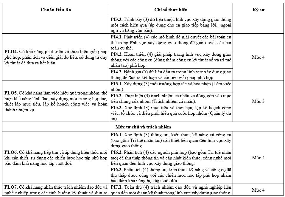 | PLO6 | Có khả năng tiếp thu và áp dụng kiến thức mới khi cần thiết, sử dụng các chiến lược học tập phù hợp bảo đảm khả năng học tập suốt đời. | x | ||