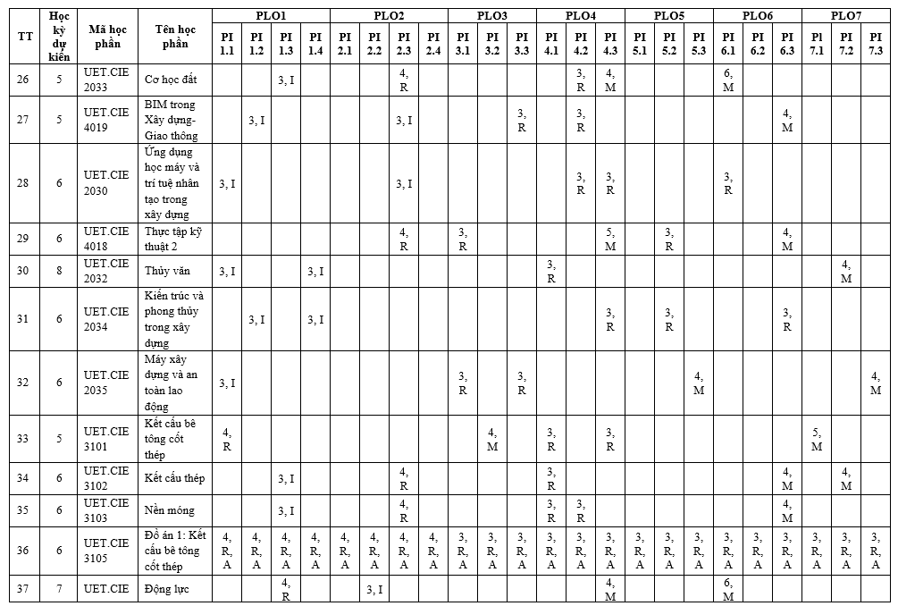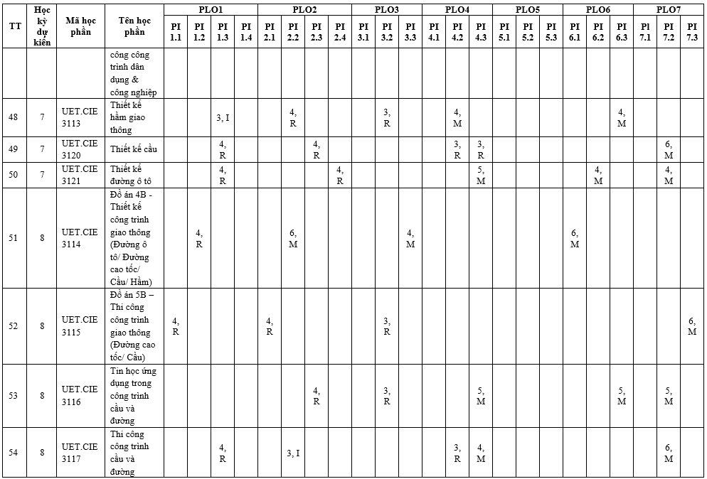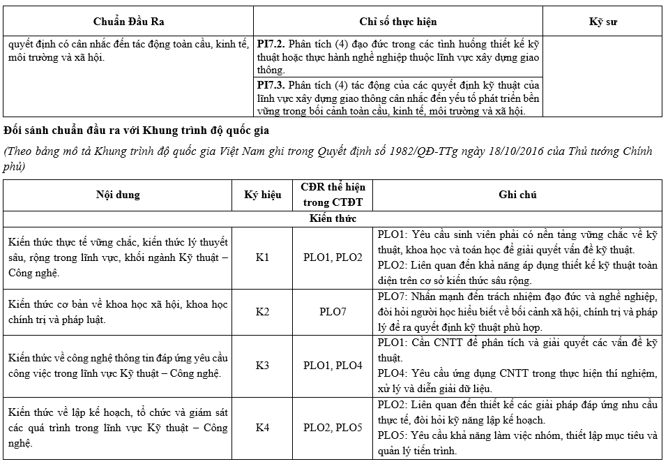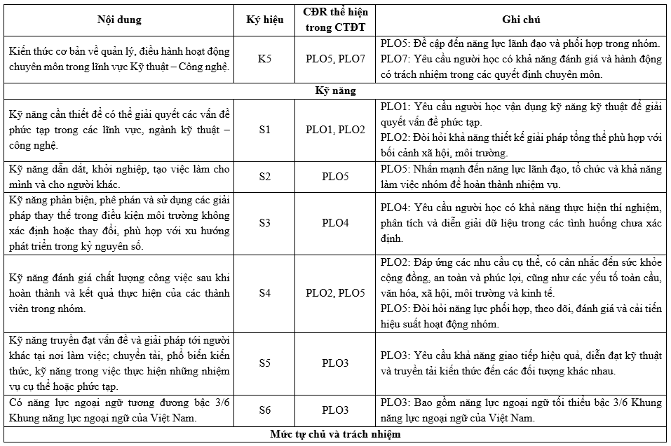 | PLO7 | Có khả năng nhận thức trách nhiệm đạo đức và nghề nghiệp trong các tình huống kỹ thuật và đưa ra quyết định có cân nhắc đến tác động toàn cầu, kinh tế, môi trường và xã hội. | x | x | |