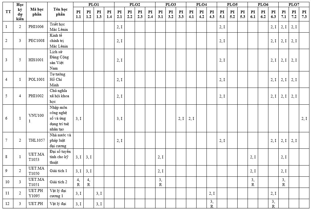| Mã PLO | Nội dung chuẩn đầu ra | Đối sánh với mục tiêu đào tạo cụ thể | ||