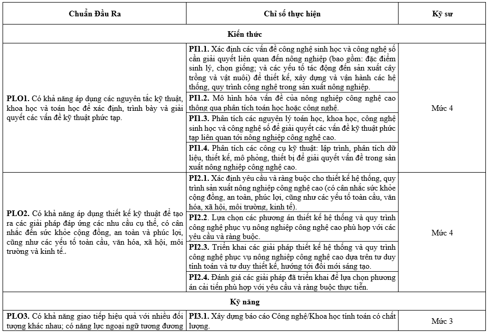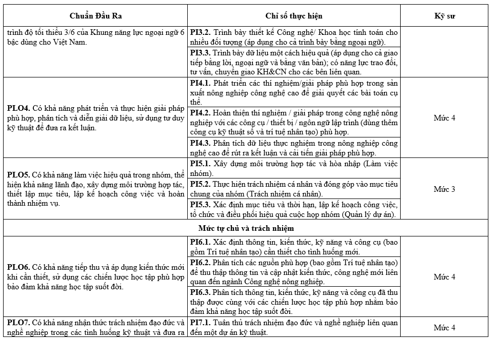 – Được trang bị kỹ năng tự học, ngoại ngữ và tư duy hệ thống, đáp ứng yêu cầu học tập suốt đời và phát triển nghề nghiệp bền vững trong bối cảnh chuyển đổi số và nông nghiệp hiện đại.