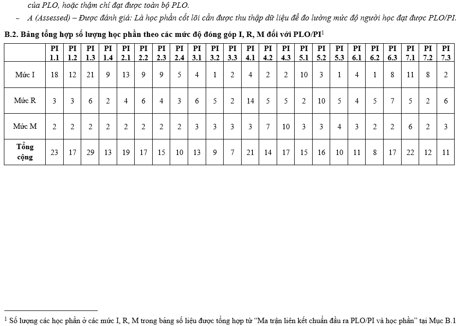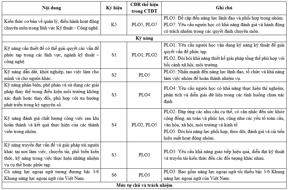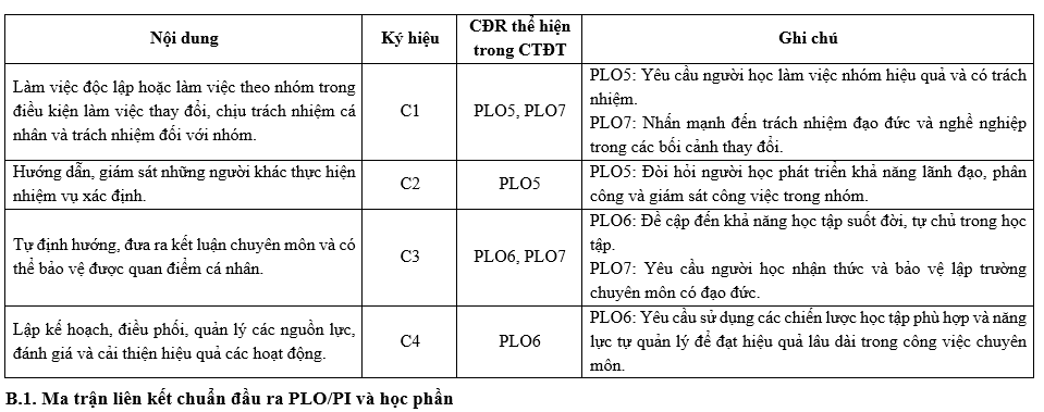 Các Chuẩn đầu ra (CĐR) của Chương trình đào tạo (CTĐT) bao gồm CĐR kiến thức, CĐR kỹ năng và CĐR mức tự chủ và trách nhiệm. CĐR bao gồm các mục (1) đến (7) như sau: