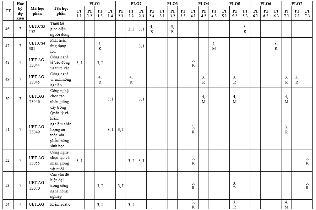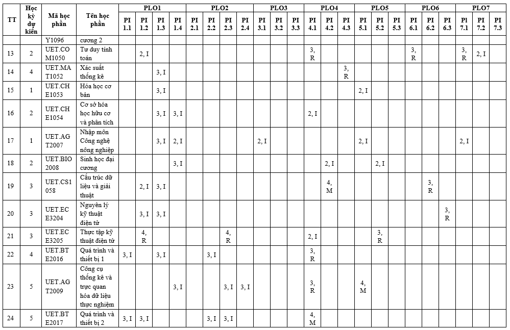 | PLO7 | Có khả năng nhận thức trách nhiệm đạo đức và nghề nghiệp trong các tình huống kỹ thuật và đưa ra quyết định có cân nhắc đến tác động toàn cầu, kinh tế, môi trường và xã hội. | x | x | |