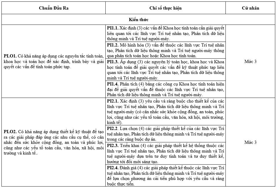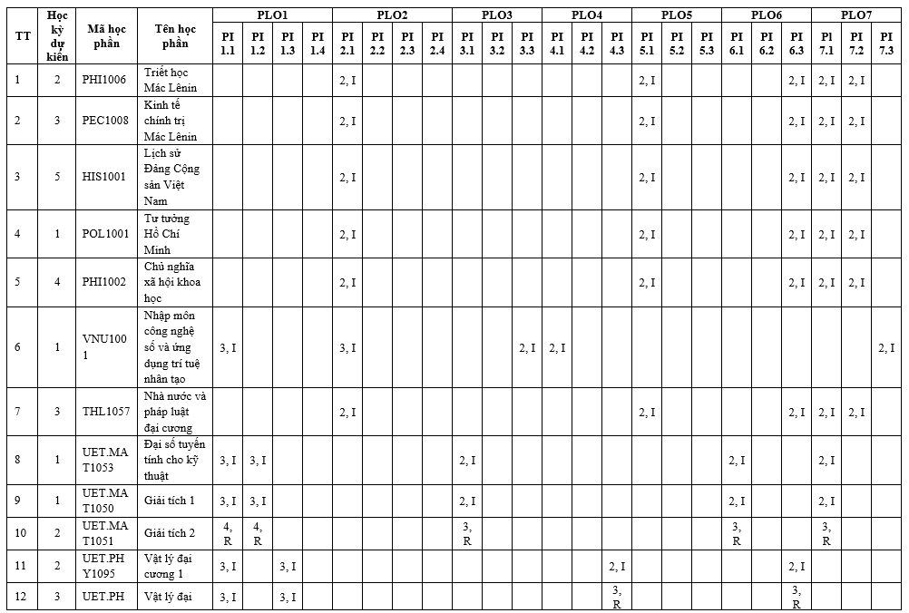 Các Chuẩn đầu ra (CĐR) của Chương trình đào tạo (CTĐT) bao gồm CĐR kiến thức, CĐR kỹ năng và CĐR mức tự chủ và trách nhiệm. CĐR bao gồm các mục (1) đến (7) như sau: