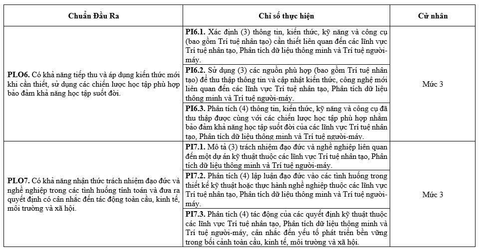 | PLO6 | Có khả năng tiếp thu và áp dụng kiến thức mới khi cần thiết, sử dụng các chiến lược học tập phù hợp bảo đảm khả năng học tập suốt đời. | x | ||