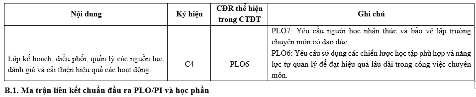 | Mã PLO | Nội dung chuẩn đầu ra | Đối sánh với mục tiêu đào tạo cụ thể | ||