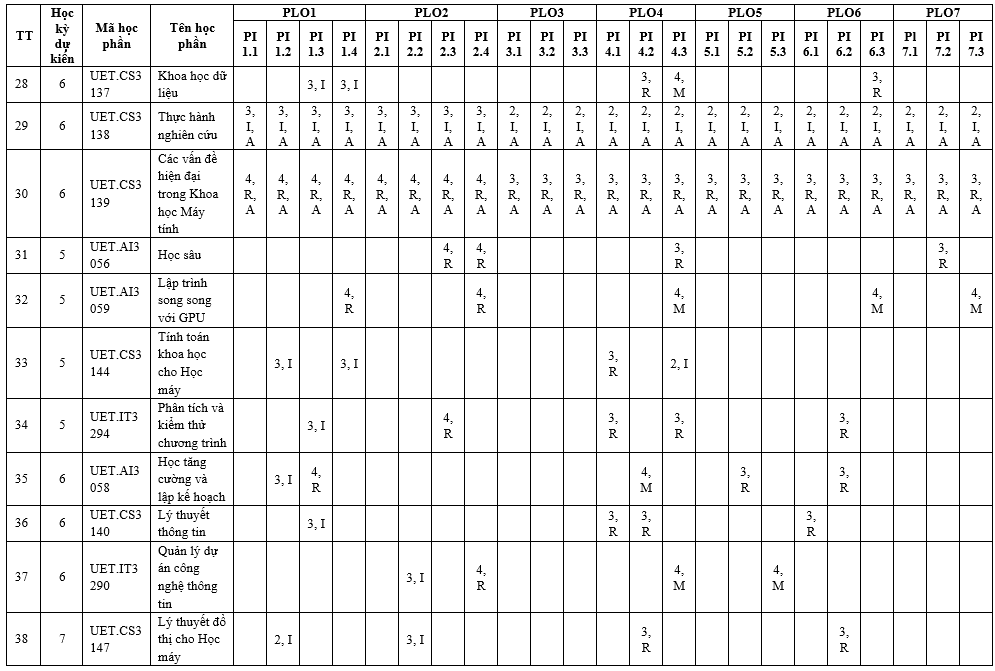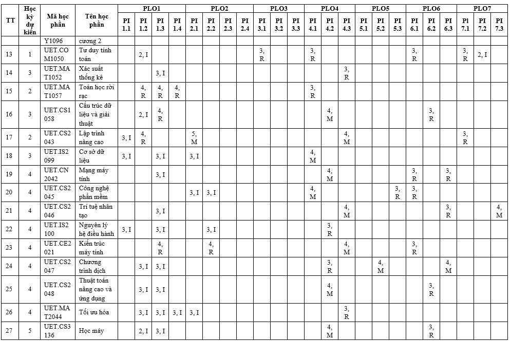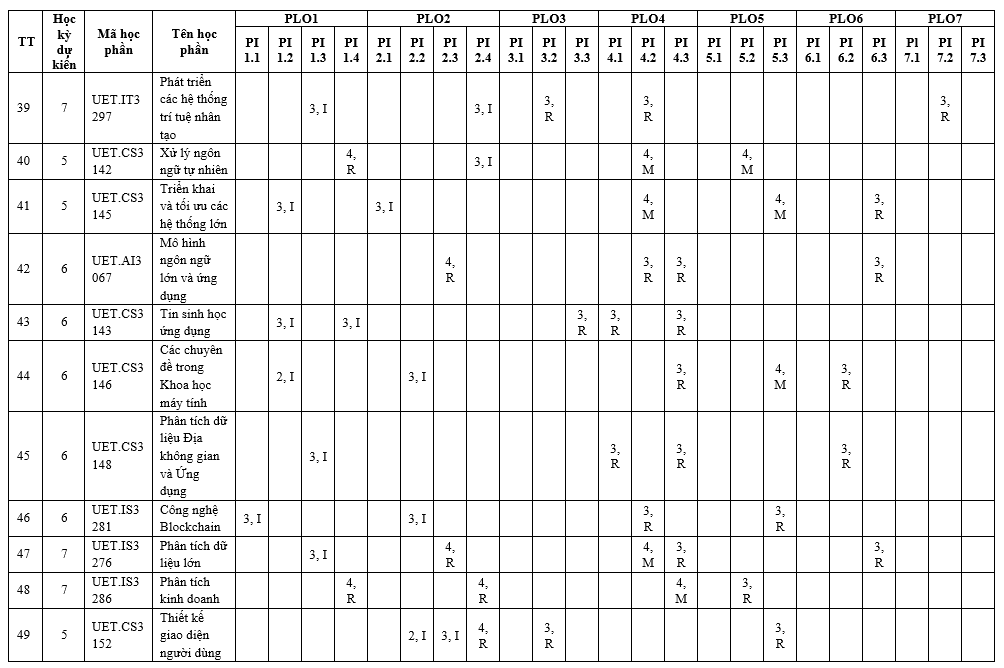 | PLO7 | Có khả năng nhận thức trách nhiệm đạo đức và nghề nghiệp trong các tình huống tính toán và đưa ra quyết định có cân nhắc đến tác động toàn cầu, kinh tế, môi trường và xã hội. | x |