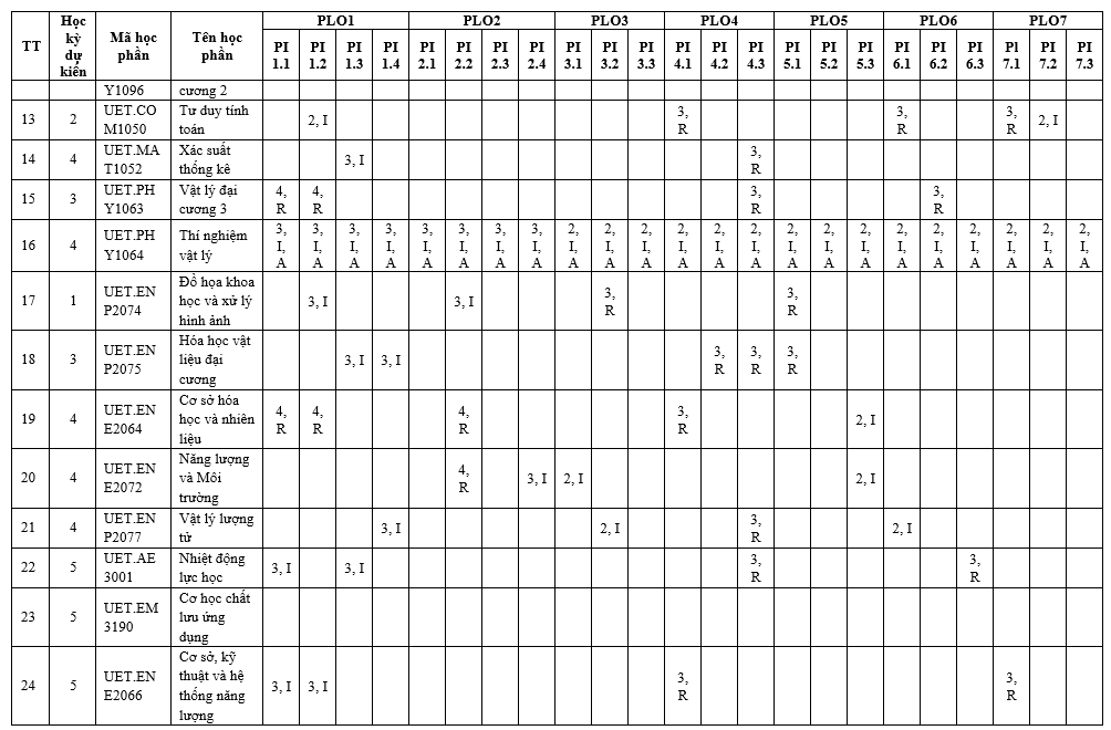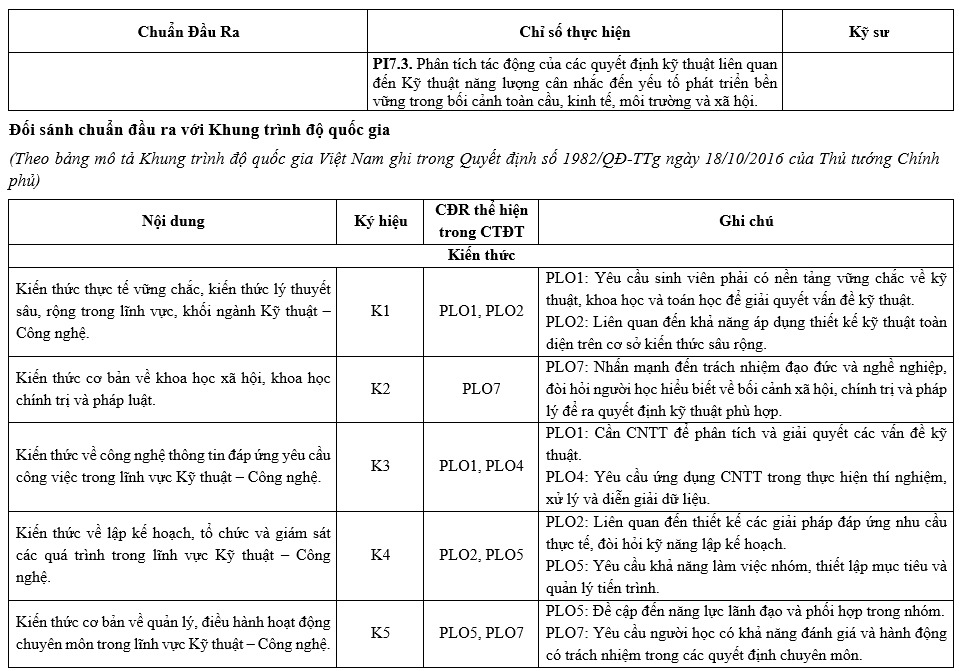 | PLO7 | Có khả năng nhận thức trách nhiệm đạo đức và nghề nghiệp trong các tình huống kỹ thuật và đưa ra quyết định có cân nhắc đến tác động toàn cầu, kinh tế, môi trường và xã hội. | x | x | |
