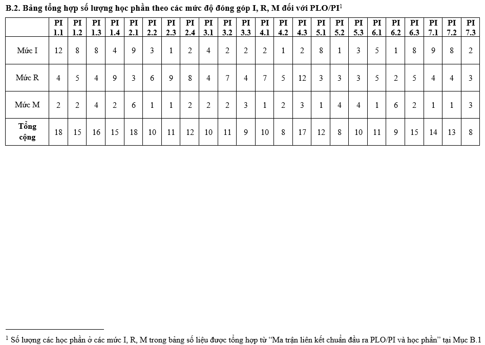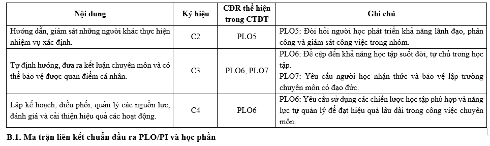 Các Chuẩn đầu ra (CĐR) của Chương trình đào tạo (CTĐT) bao gồm CĐR kiến thức, CĐR kỹ năng và CĐR mức tự chủ và trách nhiệm. CĐR bao gồm các mục (1) đến (7) như sau:
