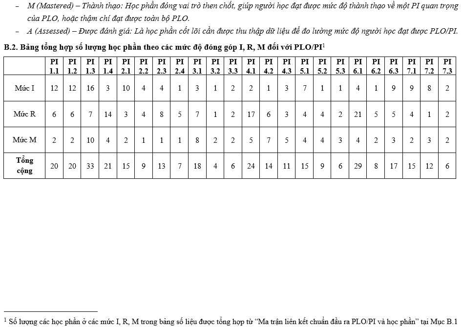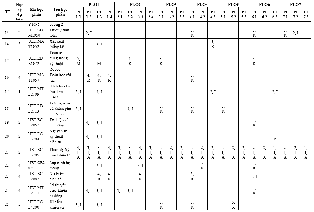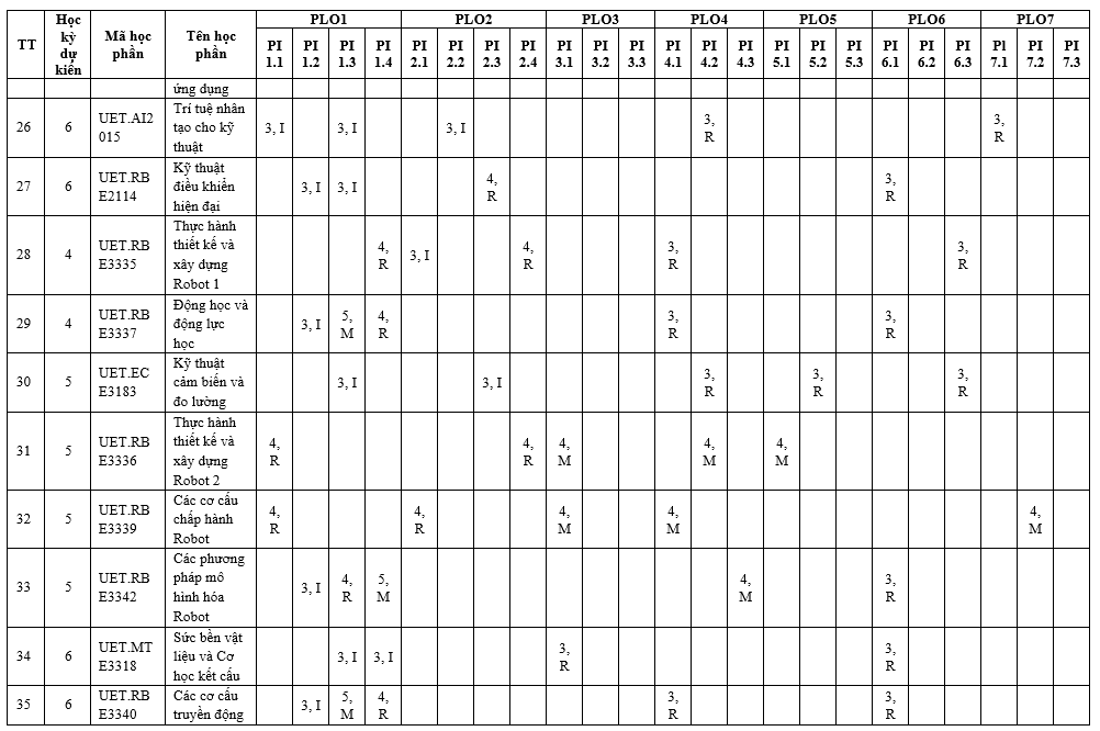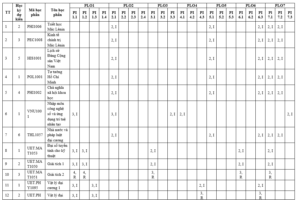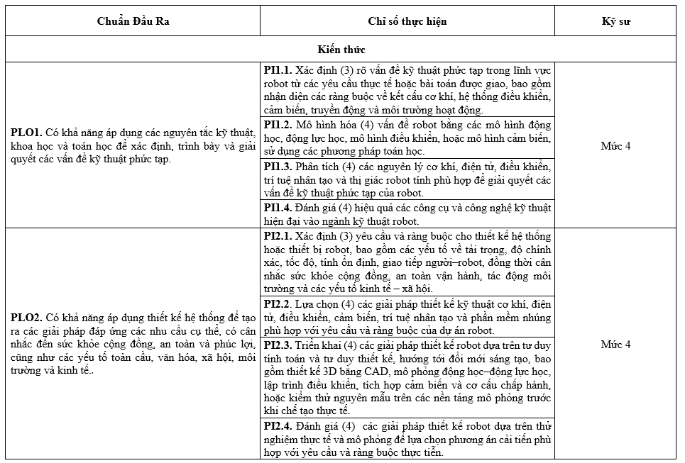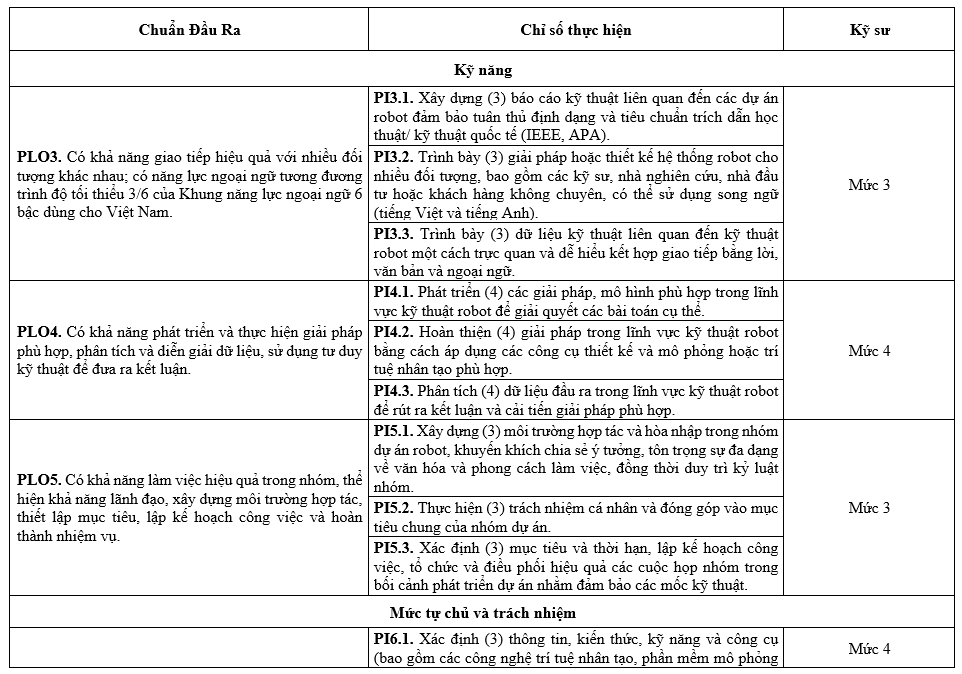 Các Chuẩn đầu ra (CĐR) của Chương trình đào tạo (CTĐT) bao gồm CĐR kiến thức, CĐR kỹ năng và CĐR mức tự chủ và trách nhiệm. CĐR bao gồm các mục (1) đến (7) như sau: