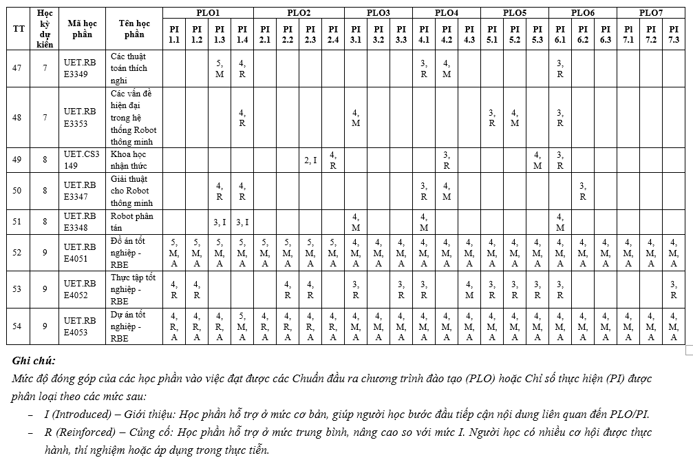 | Mã PLO | Nội dung chuẩn đầu ra | Đối sánh với mục tiêu đào tạo cụ thể | ||