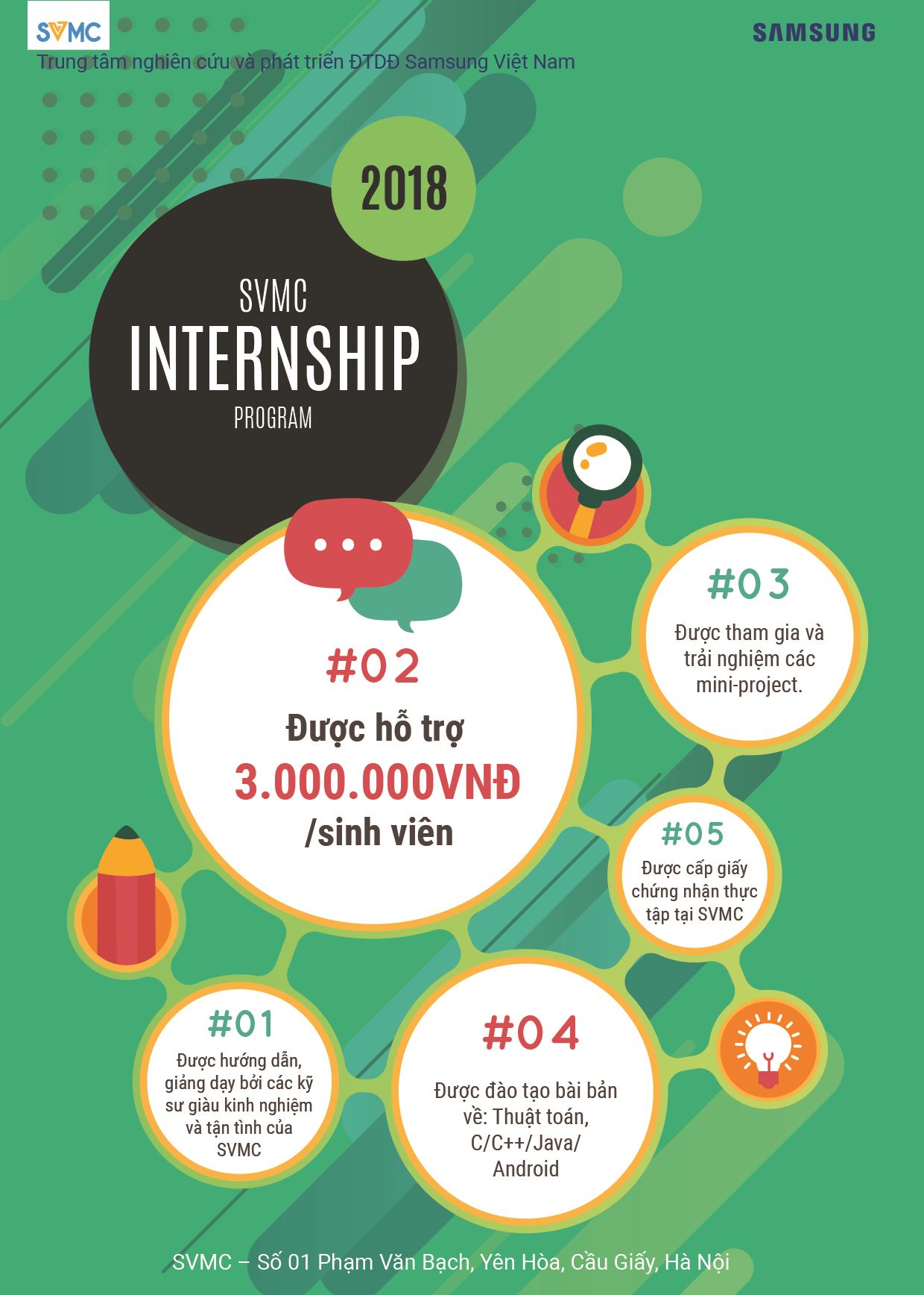 Trong khuôn khổ hợp tác giữa Samsung Electronics Việt Nam và các trường Đại học/ Học viện lớn tại miền Bắc, SVMC Internship Program là chương trình thiết thực và ý nghĩa nhằm chuẩn bị hành trang trước khi ra trường cho các bạn sinh viên, cung cấp nền tảng tri thức và kĩ năng vững chắc cần có để trở thành một Nhân viên Lập trình tài năng theo tiêu chuẩn toàn cầu của Tập đoàn Samsung. Ngoài ra, sinh viên còn có cơ hội học hỏi và trải nghiệm môi trường làm việc năng động, chuyên nghiệp và hiện đại tại Trung tâm nghiên cứu và phát triển Điện thoại Di động lớn nhất Đông Nam Á của Samsung.