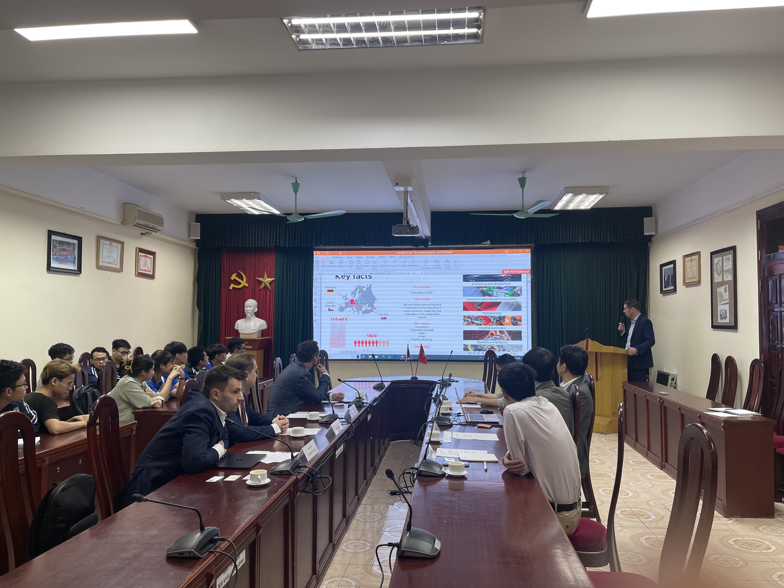Tại buổi tiếp, ông Martin Kele – Giám đốc điều hành Tập đoàn đã bày tỏ niềm vui được đến thăm và làm việc với Trường ĐH Công nghệ, một trong những trường đại học hàng đầu về đào tạo công nghệ kỹ thuật của Việt Nam, đồng thời cảm ơn lãnh đạo Nhà trường đã dành cho đoàn sự đón tiếp trọng thị. Giám đốc Tập đoàn ô tô Matador chia sẻ với lãnh đạo Trường ĐH Công nghệ định hướng chiến lược phát triển của Tập đoàn trong thời gian tới. Đồng thời giới thiệu về Tập đoàn và cơ hội thực tập tại Matador trong các dự án phát triển của ngành công nghiệp tự động.