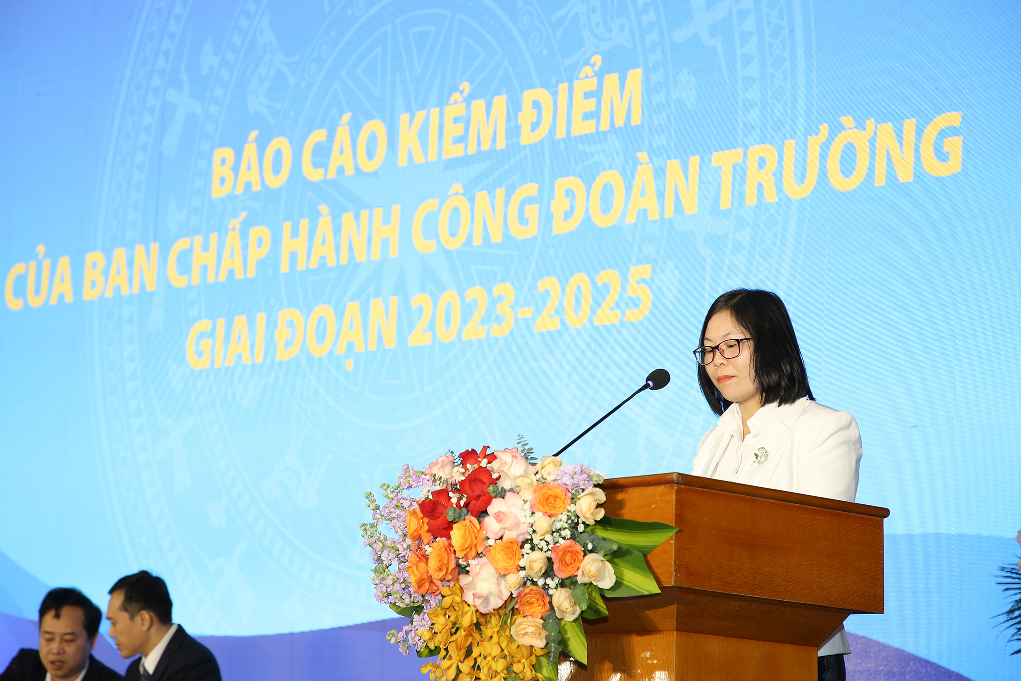 TS. Hà Thị Quyến – ủy viên Ban Chấp hành Công đoàn khóa VI báo cáo kiểm điểm của Ban chấp hành Công đoàn Trường