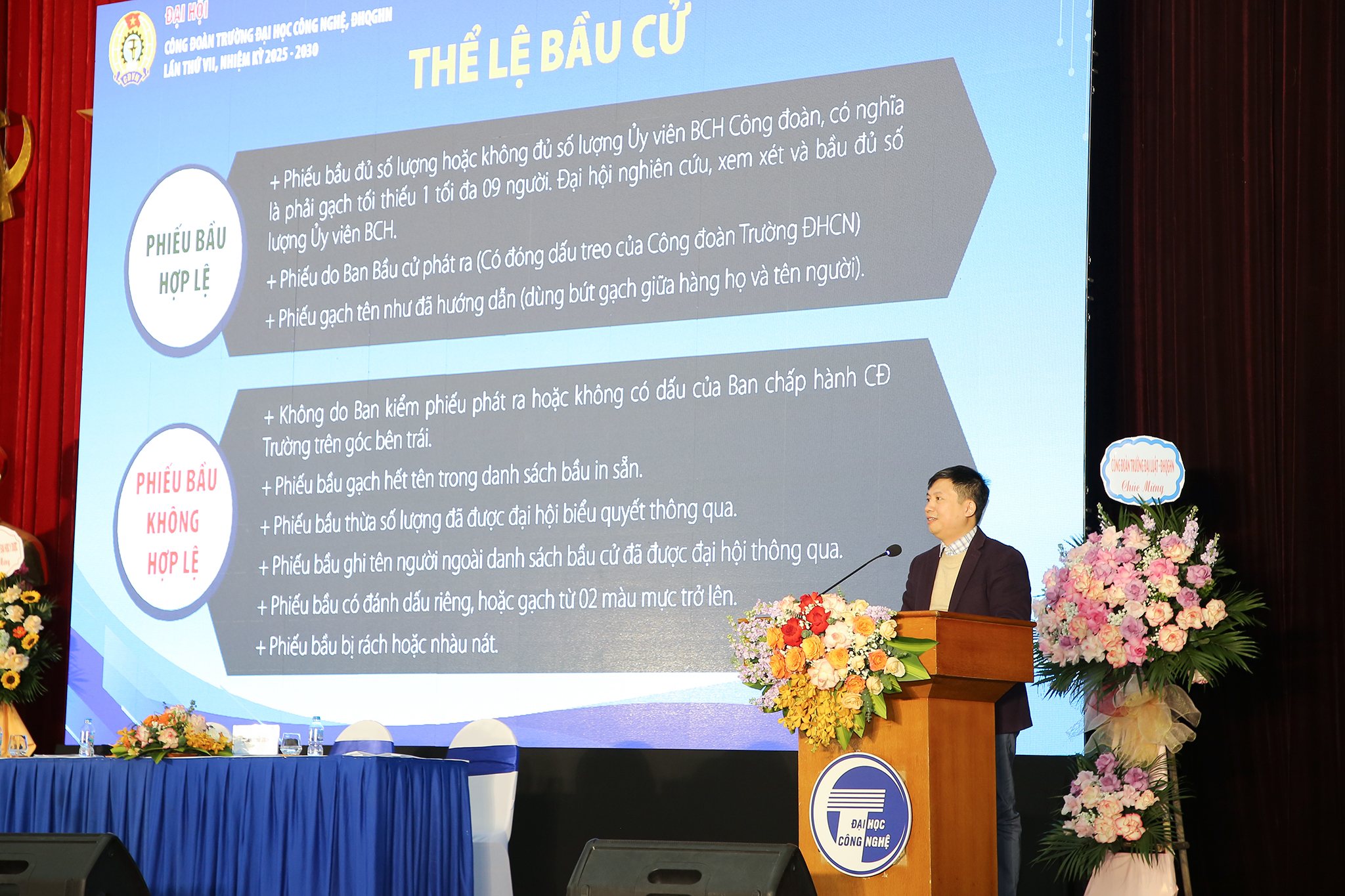 Tại Đại hội, đồng chí Nguyễn Văn Đoàn, Ủy viên Ban Thường vụ Công đoàn ĐHQGHN ghi nhận và đánh giá cao những nỗ lực, tinh thần đoàn kết và sự chủ động đổi mới của Ban Chấp hành Công đoàn khóa VI cũng như toàn thể Công đoàn Trường ĐH Công nghệ trong nhiệm kỳ vừa qua. Đồng thời cũng đưa ra một số nhiệm vụ trong nhiệm kỳ 2025 – 2030, Công đoàn Trường ĐH Công nghệ cần tiếp tục tham gia hiệu quả vào công tác quản lý, quản trị Nhà trường nhằm bảo đảm quyền và lợi ích chính đáng của người lao động; chú trọng chăm lo đời sống vật chất, tinh thần của đoàn viên; đẩy mạnh công tác tuyên truyền trong bối cảnh nhiều biến động; đồng thời tăng cường đào tạo, bồi dưỡng đội ngũ cán bộ công đoàn để đáp ứng yêu cầu mới của thời kỳ phát triển.