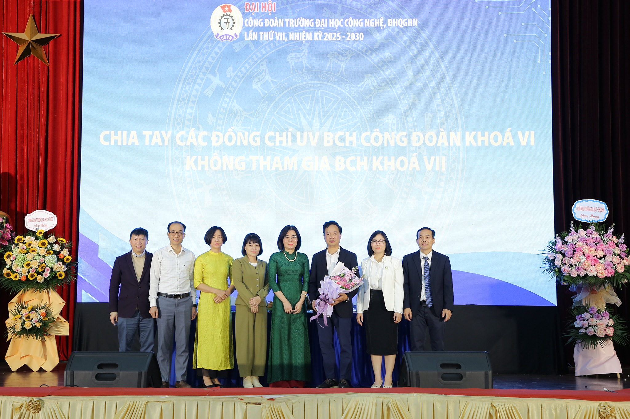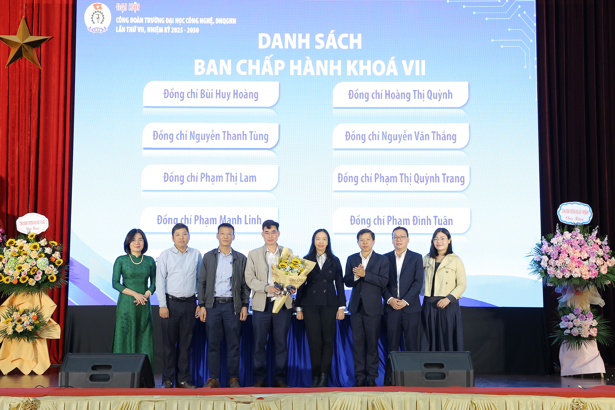 TS. Nguyễn Thu Hương (bìa trái ảnh) – Phó Hiệu trưởng Trường ĐH Công nghệ tặng hoa chúc mừng Ban Chấp hành Công đoàn Trường khóa VII