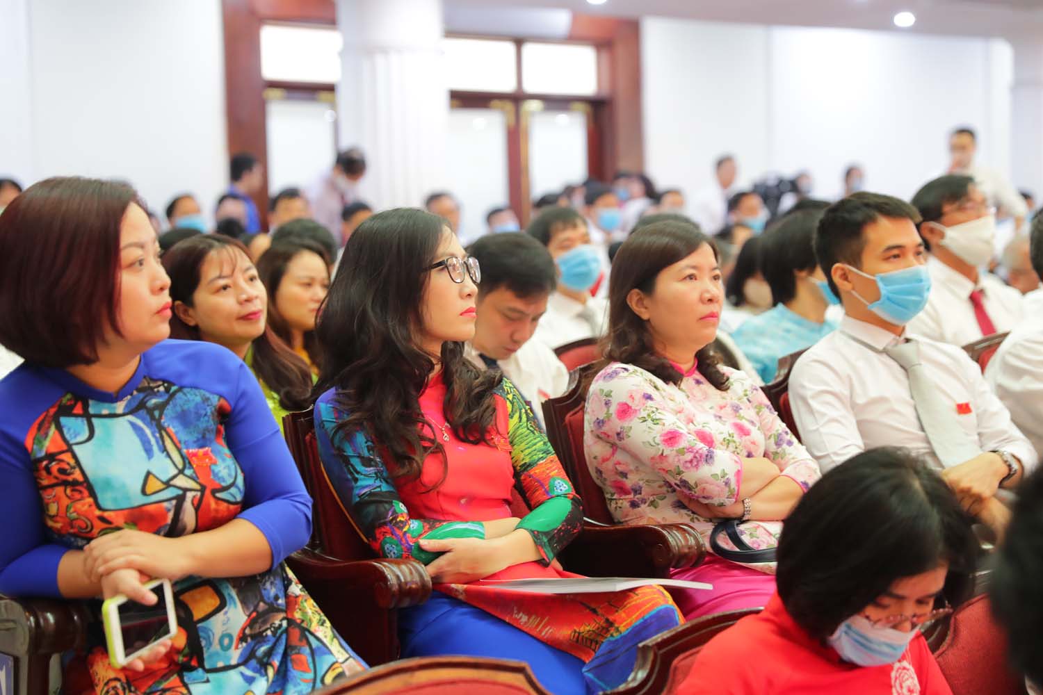 Các đại biểu xếp hàng vào hội trường đảm bảo khoảng cách tối thiểu …