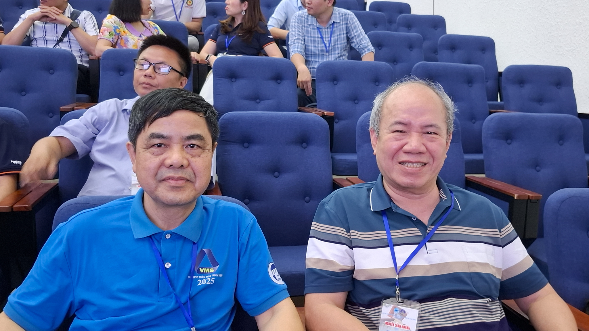 Thầy Lê Phê Đô (áo xanh) chụp ảnh kỷ niệm cùng thầy Nguyễn Cảnh Hoàng (cựu giáo chức Khoa Công nghệ thông tin, huấn luyện và làm Trưởng đoàn từ khi thành lập Trường đến năm 2012)