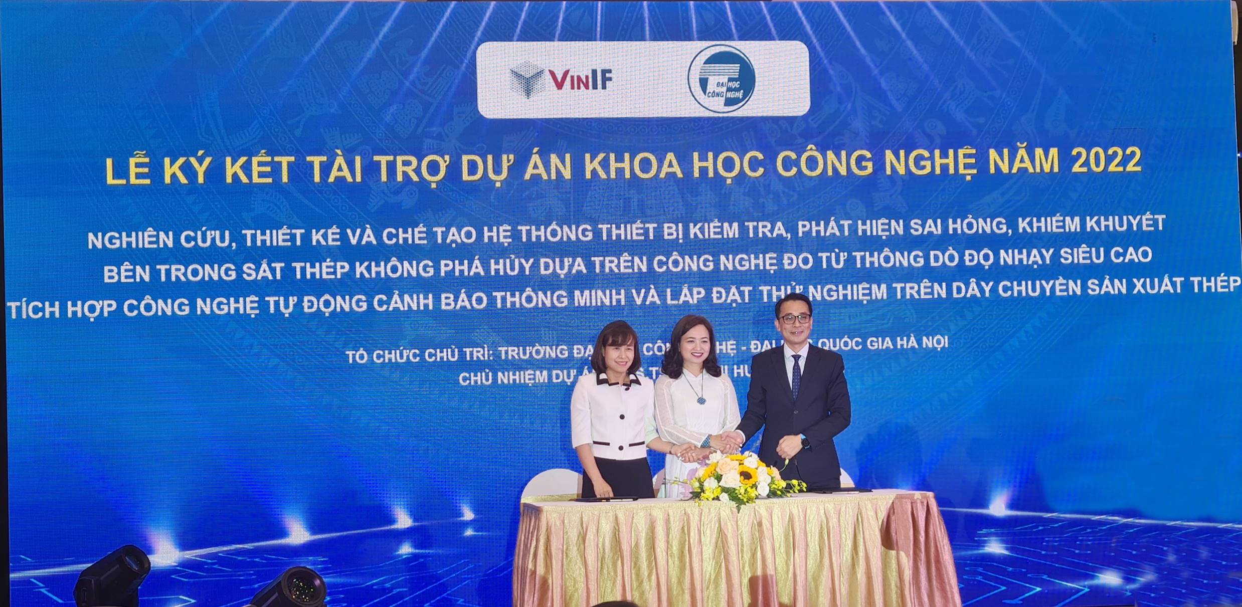 Đây là năm thứ tư Trường ĐHCN nhận được tài trợ dự án nghiên cứu đối với các công trình khoa học do Quỹ VinIF tổ chức. Năm 2019, đề tài “Hệ thống trí tuệ nhân tạo chuẩn đoán và tiên lượng bệnh nhồi máu cơ tim dựa trên siêu âm tim” do TS. Trần Quốc Long (Khoa Công nghệ thông tin) – là Chủ nhiệm đề tài được Quỹ VinIF tài trợ, với mức tài trợ là 6,5 tỷ đồng. Năm 2020, đề tài “Thiết bị và vật liệu tiên tiến cho khảo sát quy mô lớn dữ liệu về nước” của GS. TS. Hoàng Nam Nhật (khoa Vật lý kỹ thuật và công nghệ nano) là Chủ nhiệm đề tài và “Hệ thống giao tiếp tiếng Việt dựa trên AI sử dụng tín hiệu mắt và tín hiệu điện não cho người tổn thương chức năng vận động” do PGS.TS. Lê Thanh Hà (khoa Công nghệ thông tin) – là Chủ nhiệm đề tài được Quỹ VinIF tài trợ, với với tổng mức tài trợ 10 tỷ đồng. Năm 2021, Thiết bị và phần mềm thông minh thu nhận, xử lý và cảnh báo sớm lũ quét, sạt lở đất dựa trên nền tảng dữ liệu lớn và công nghệ IoT. PGS.TS Phạm Mạnh Thắng (Khoa Cơ học kỹ thuật và tự động hóa) là Chủ nhiệm đề tài được Quỹ VinIF tài trợ.