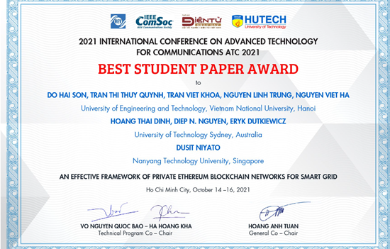 Báo cáo “An Effective Framework of Private Ethereum Blockchain Networks for Smart Grid” (tiếng Việt: “Mô hình mạng chuỗi khối Ethereum riêng tư và hiệu quả sử dụng cho lưới điện thông minh”) gồm nhóm tác giả Viện Tiên tiến về Kỹ thuật và Công nghệ (Trường Đại học Công nghệ – Đại học Quốc gia Hà Nội) thực hiện, đạt giải Best Student Paper tại Hội nghị Quốc tế về Công nghệ Tiên tiến trong Truyền thông 2021.