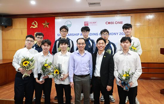 TS Bùi Trung Ninh (áo tím) đồng hành cùng sinh viên nhận học bổng ADF trị giá 50 triệu đồng/năm