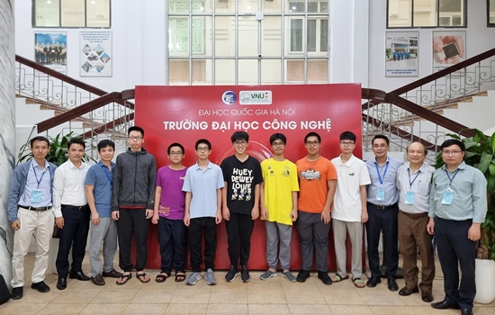 7 thí sinh đạt giải thưởng là các em Phạm Ngọc Trung, Nguyễn Hữu Tuấn, Trần Gia Huy, Nguyễn Tuấn Linh, Phạm Công Minh, Hoàng Xuân Bách, Nguyễn Tùng Lâm (đứng từ thứ 4 đến 10 tính từ trái sang phải) cùng với thầy Đỗ Đức Đông (Trưởng đoàn, ngoài cùng bên phải), thầy Đỗ Phan Thuận (Phó đoàn, ngoài cùng bên trái) và các thầy trong Ban tổ chức thi trực tuyến tại Trường ĐH Công nghệ, Đại học Quốc gia Hà Nội