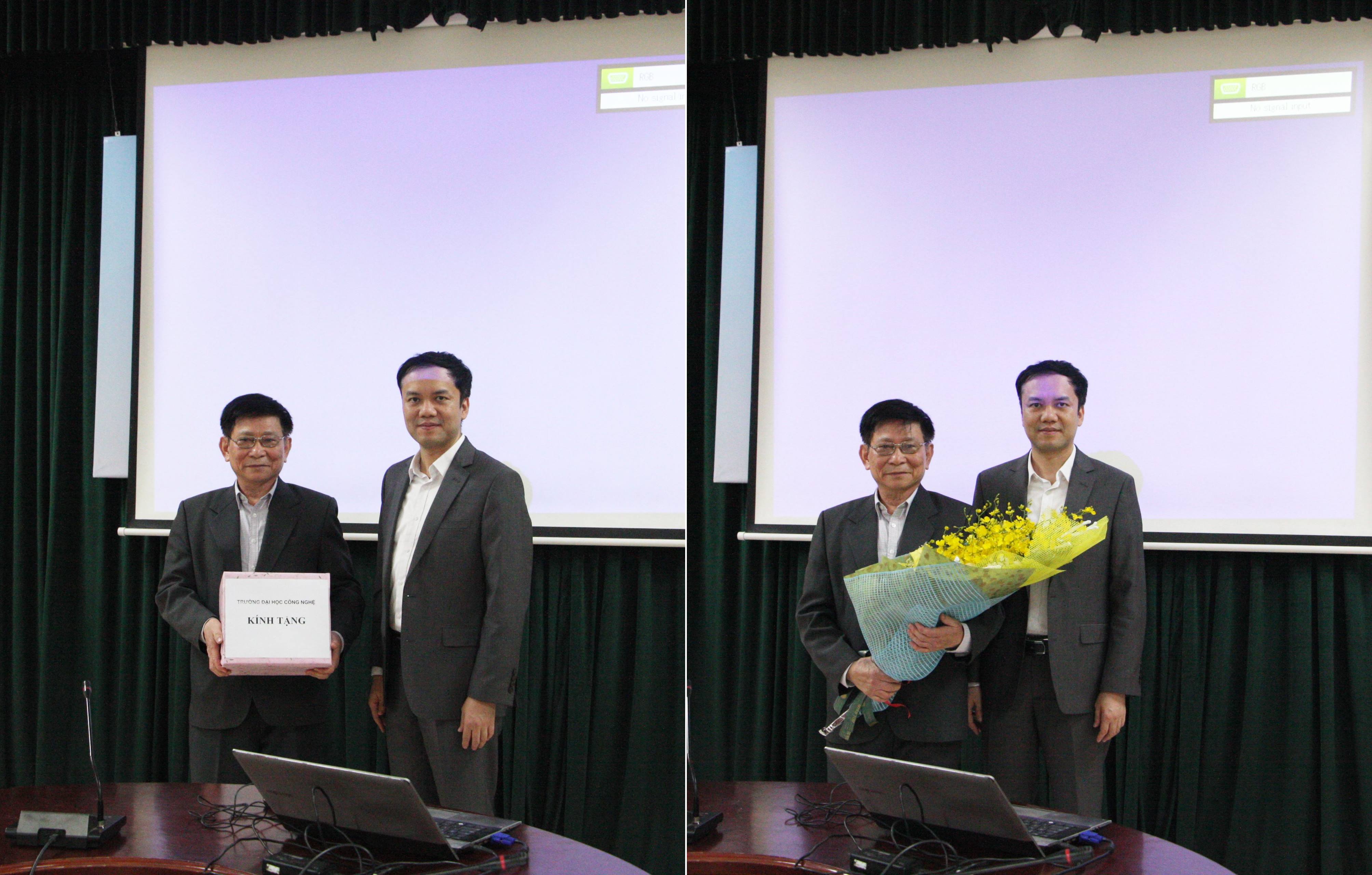 Buổi gặp mặt có sự tham dự của PGS.TS. Nguyễn Việt Hà – Hiệu trưởng Nhà trường, GS.TS. Chử Đức Trình – Phó Hiệu trưởng, TS. Nguyễn Anh Thái – Phó Hiệu trưởng, PGS.TS. Trịnh Anh Vũ – Chủ tịch Công đoàn và lãnh đạo, cán bộ các đơn vị trong Trường ĐHCN.
