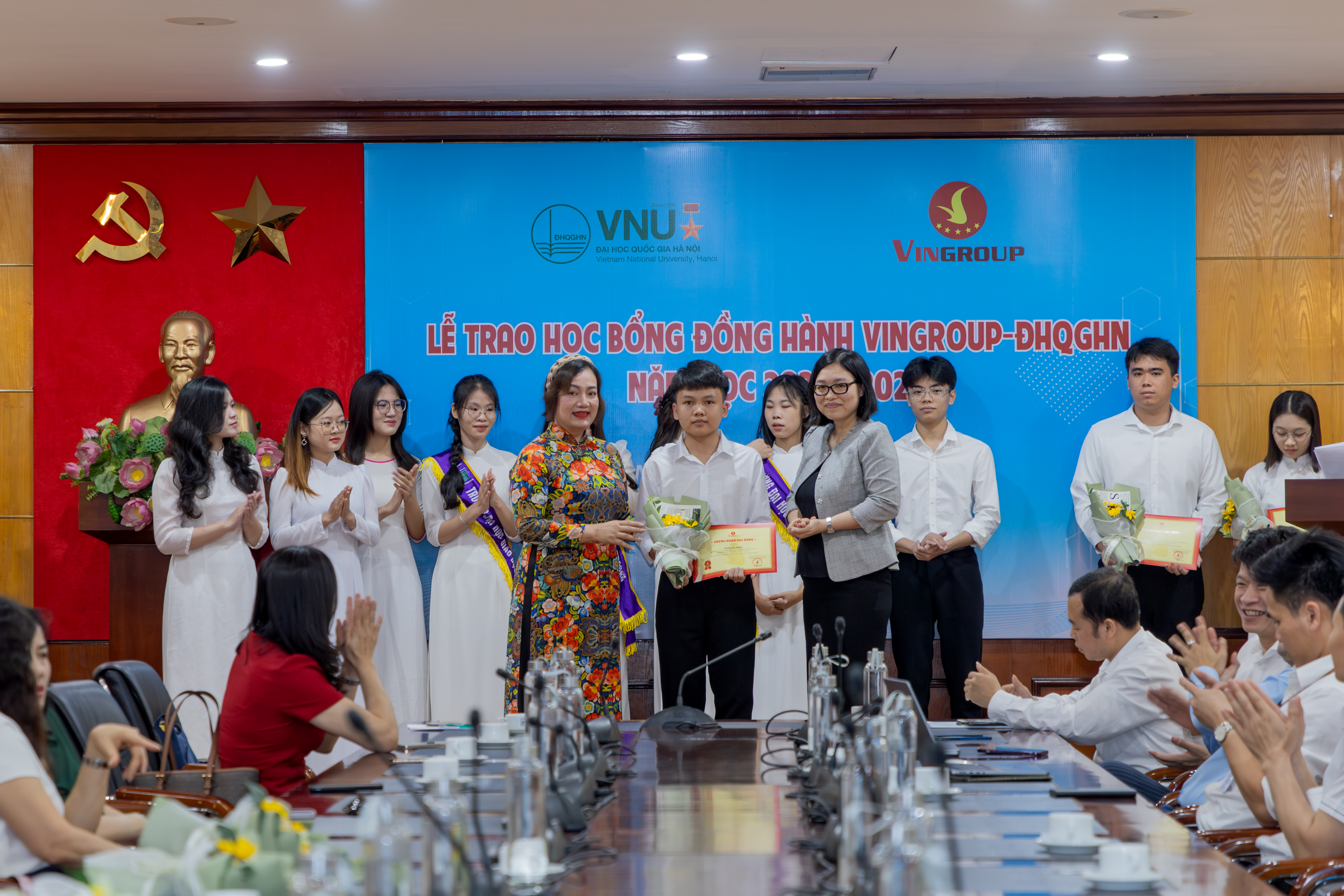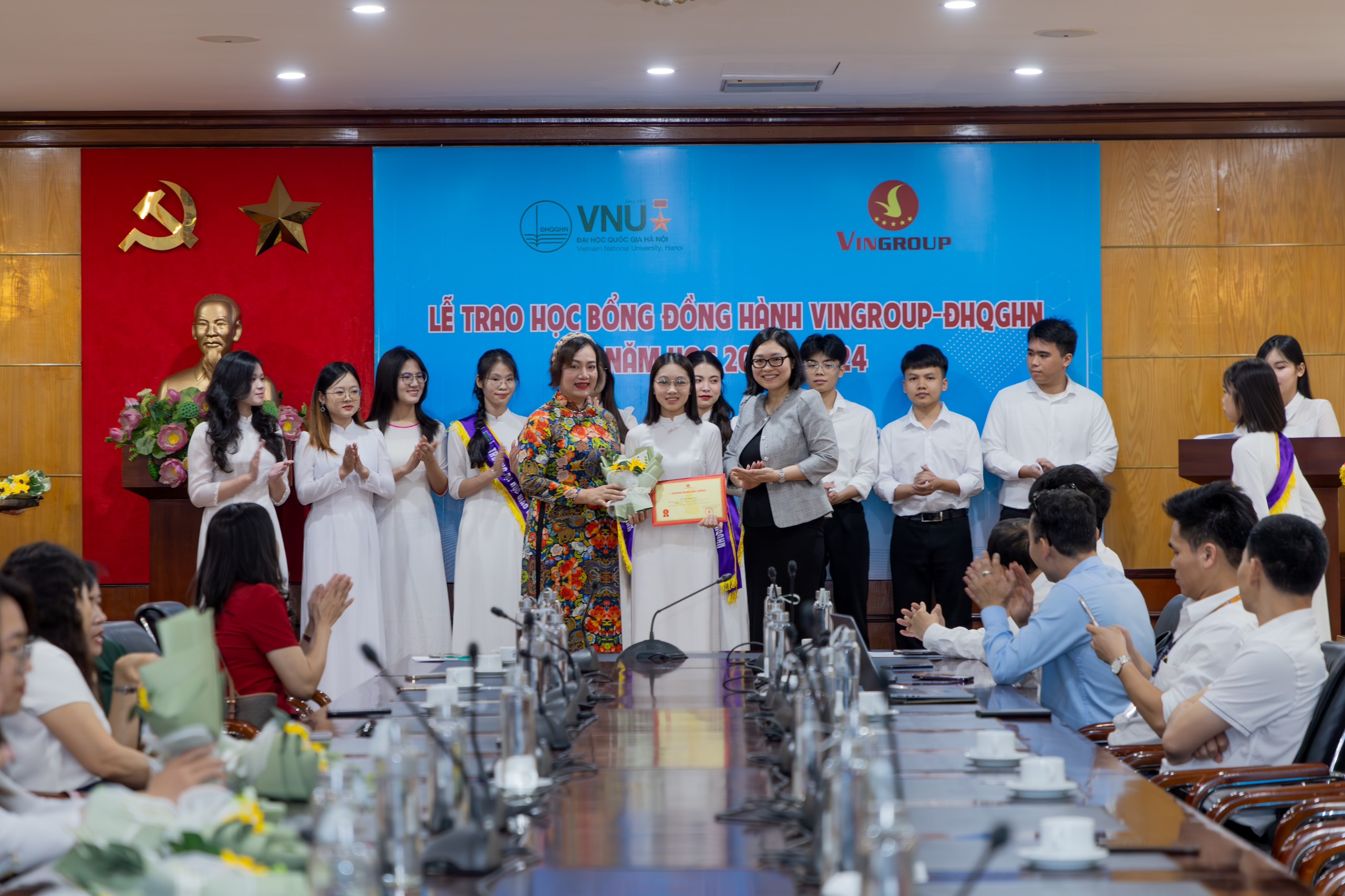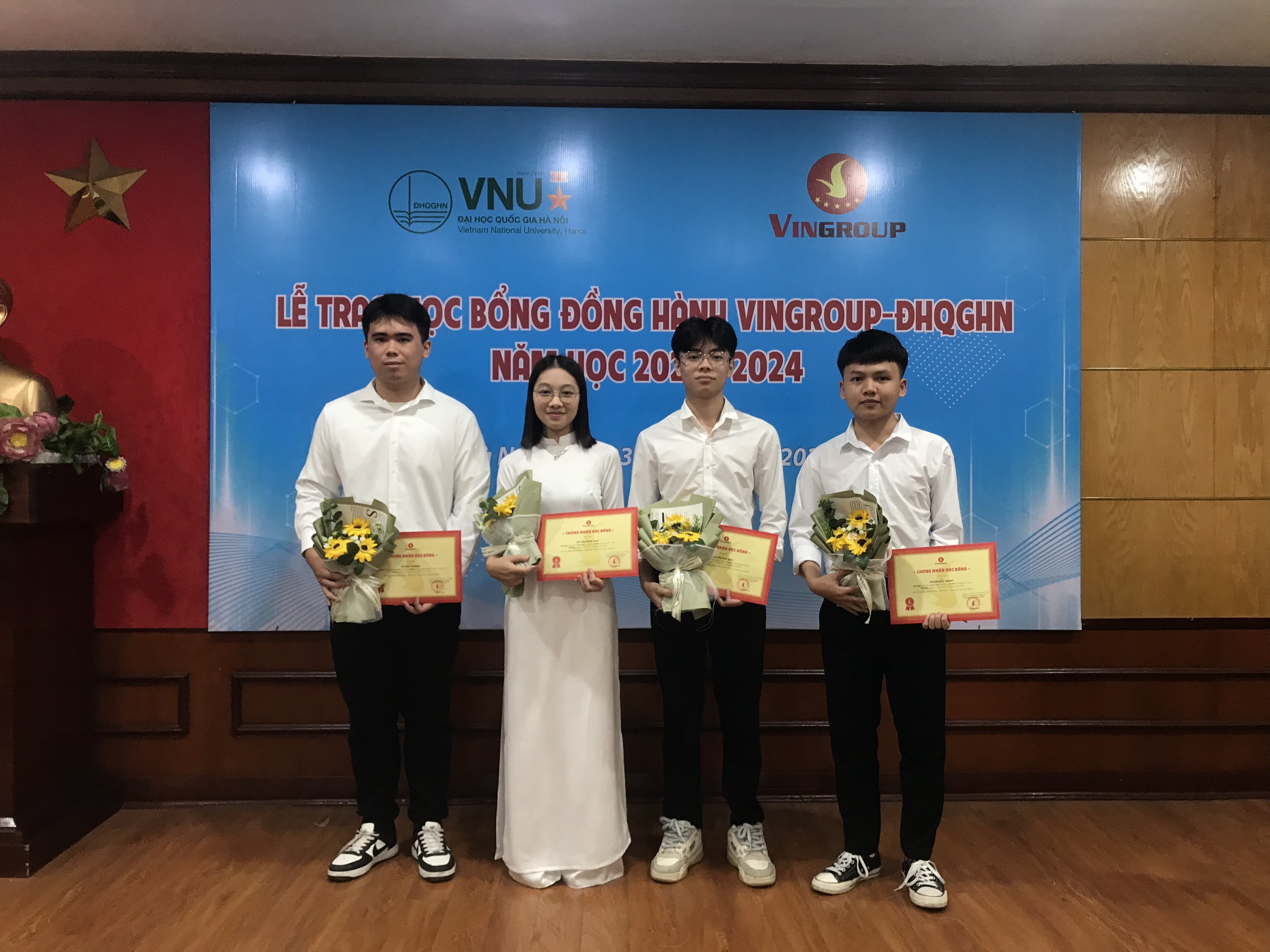 Sinh viên Vũ Thị Minh Thư (thứ hai, bên trái ảnh) và Đoàn Đức Mạnh (ngoài cùng, bên phải ảnh) nhận học bổng Đồng hành Vingroup