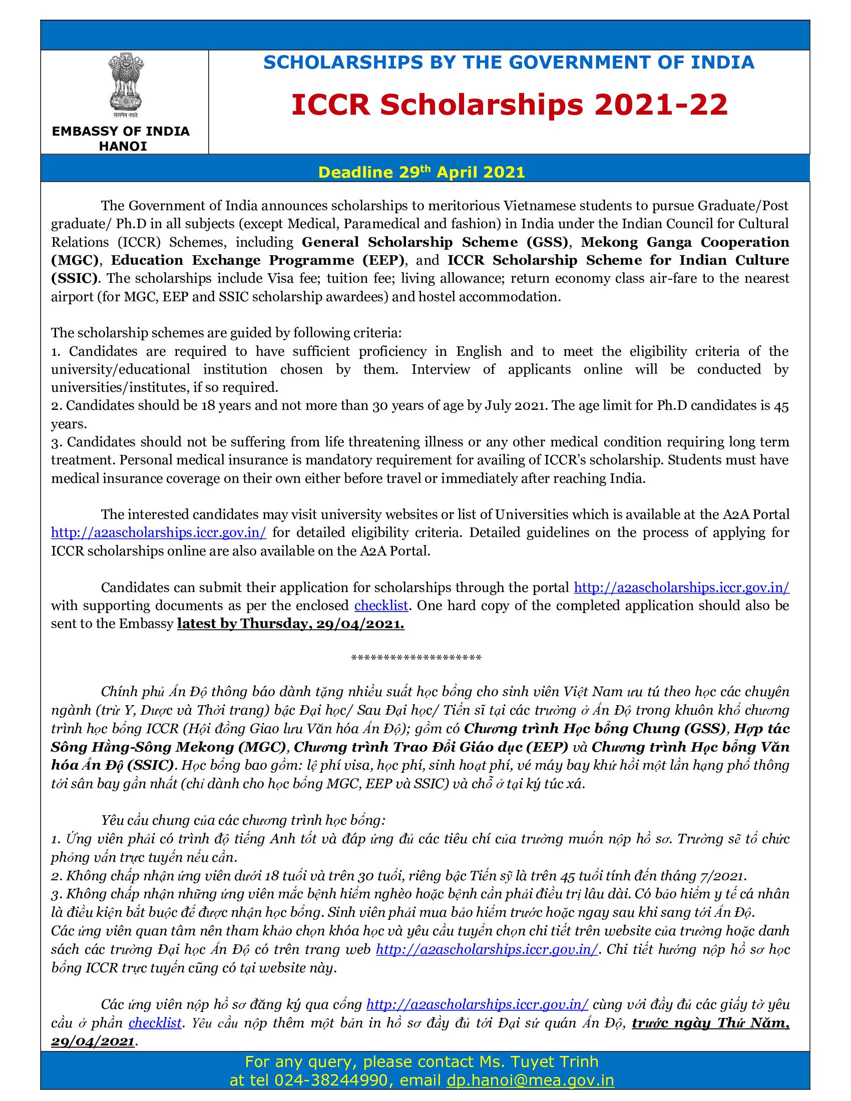 Đại sứ quán Ấn Độ trân trọng thông báo: Chính phủ Ấn Độ dành tặng nhiều suất học bổng cho sinh viên Việt Nam ưu tú theo học các chuyên ngành (trừ Y, Dược và Thời trang) bậc Đại học/ Sau Đại học/ Tiến sĩ tại các trường ở Ấn Độ trong khuôn khổ các chương trình học bổng ICCR (Hội đồng Giao lưu Văn hóa Ấn Độ); gồm có Chương trình Học bổng Chung (GSS), Hợp tác Sông Hằng-Sông Mekong (MGC), Chương trình Trao Đổi Giáo dục (EEP) và Chương trình Học bổng Văn hóa Ấn Độ (đính kèm).
