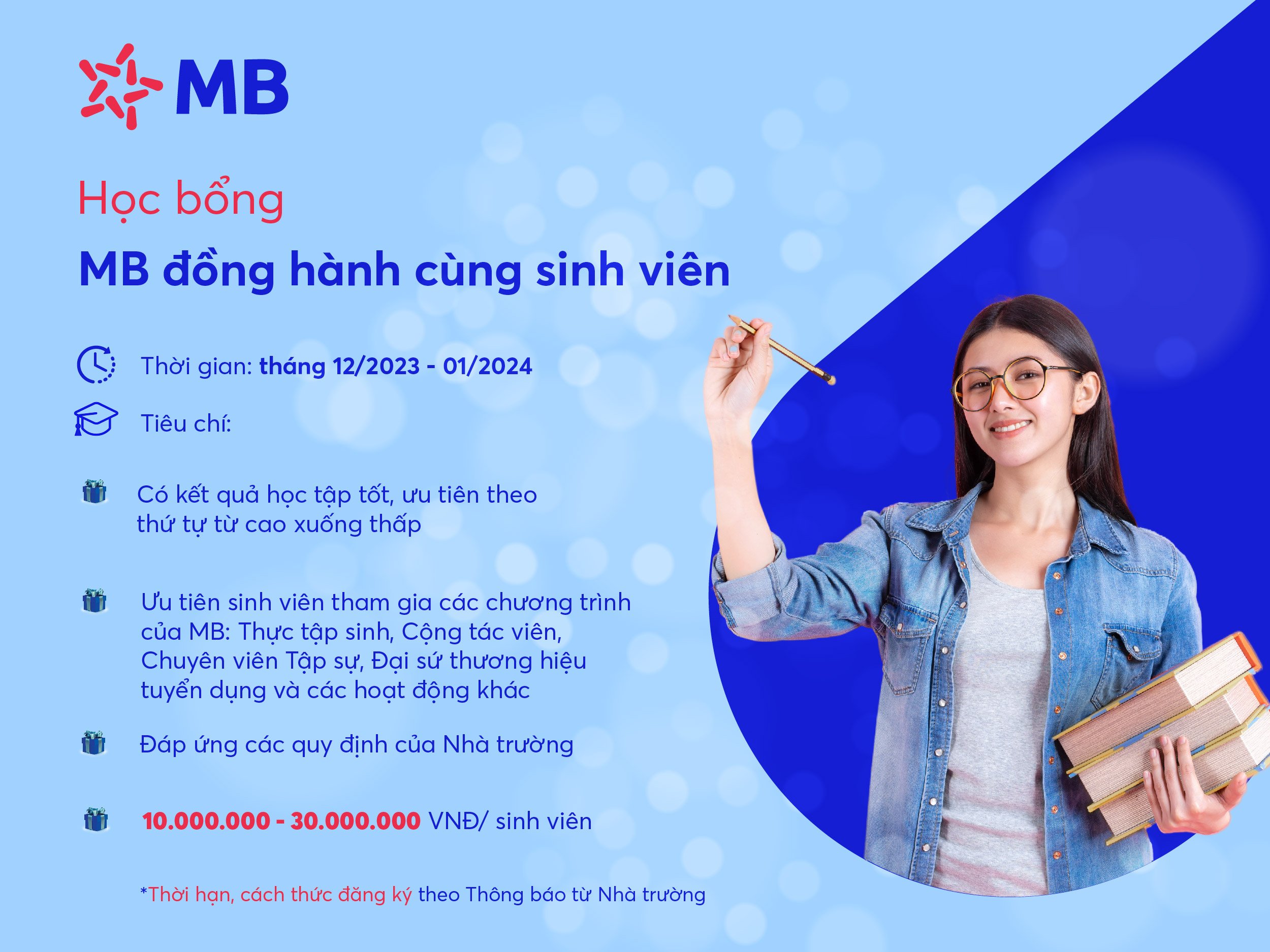 Ngày 26/12/2023, trường Đại học Công nghệ nhận được thông báo về việc tài trợ học bổng cho giáo dục trong năm học 2023-2024 của Ngân hàng Thương mại Cổ phần Quân đội, gọi tắt là Ngân hàng Quân đội (viết tắt là MB, gọi tắt là học bổng MB). Thông tin chi tiết về học bổng MB dành cho sinh viên đại học hệ chính quy Trường Đại học Công nghệ (UET) như sau: