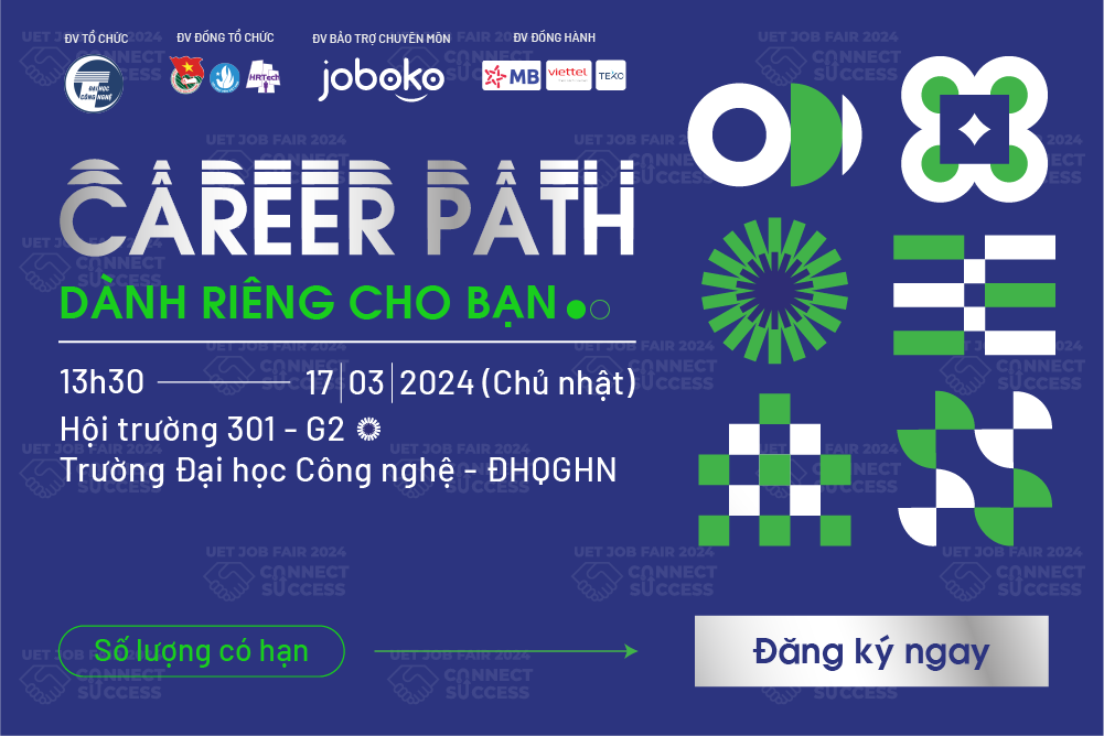 Ngày 17/03/2024 tới đây, tại giảng đường 301-G2 sẽ diễn ra hội thảo “Career Path – Dành riêng cho bạn” nằm trong chuỗi sự kiện Ngày hội việc làm – UET Job Fair 2024. Hội thảo này nhằm trang bị hành trang cho các bạn sinh viên trước khi bước chân vào thị trường lao động.