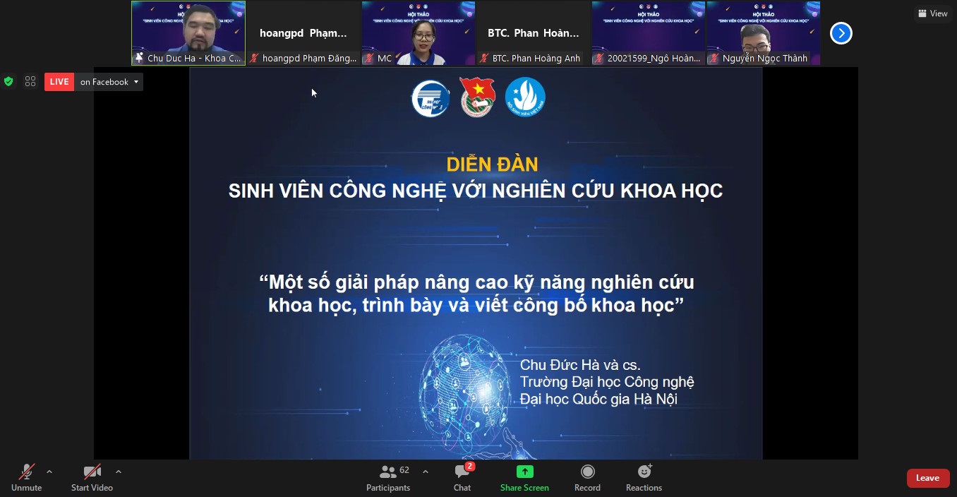 Nhằm cung cấp các kiến thức, thông tin nâng cao kỹ năng nghiên cứu khoa học đồng thời đẩy mạnh phong trào sinh viên nghiên cứu khoa học trong Trường Đại học Công nghệ (Đại học Quốc gia Hà Nội), Đoàn Thanh niên – Hội Sinh viên Trường Đại học Công nghệ phối hợp với Phòng Khoa học công nghệ & Hợp tác phát triển đã tổ chức Hội thảo trực tuyến “Sinh viên công nghệ với nghiên cứu khoa học” năm 2022, vào ngày 22/03/2022.