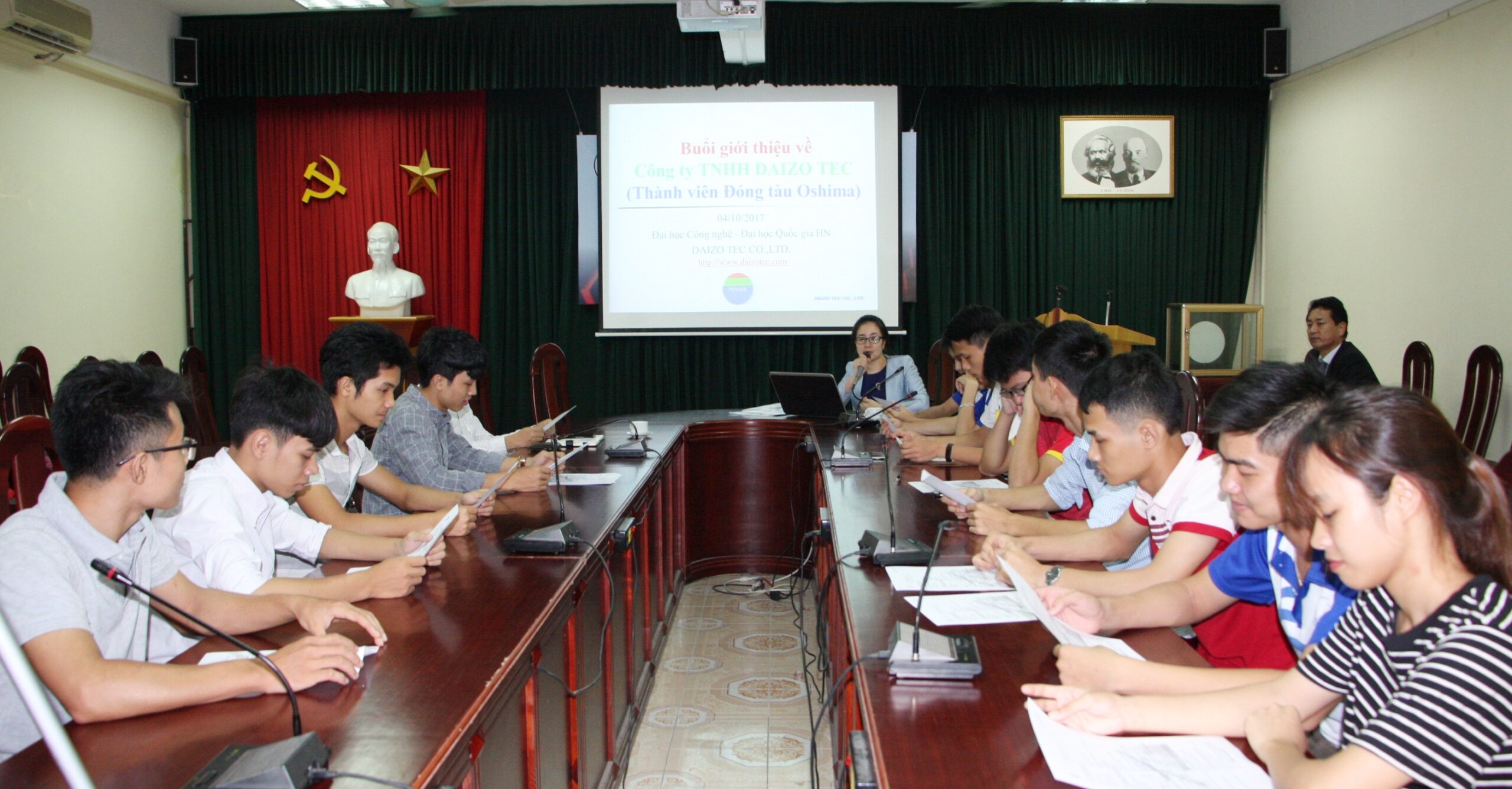 Ngày 04/10, Trường Đại học Công nghệ phối hợp với Công ty TNHH Daizo Tec (thuộc Công ty Cổ phần đóng tàu Oshima)- Nhật Bản tổ chức hội thảo tuyển dụng nhằm tìm kiếm cơ hội đầu ra cho sinh viên tốt nghiệp Khoa Cơ học kỹ thuật và Tự động hóa.