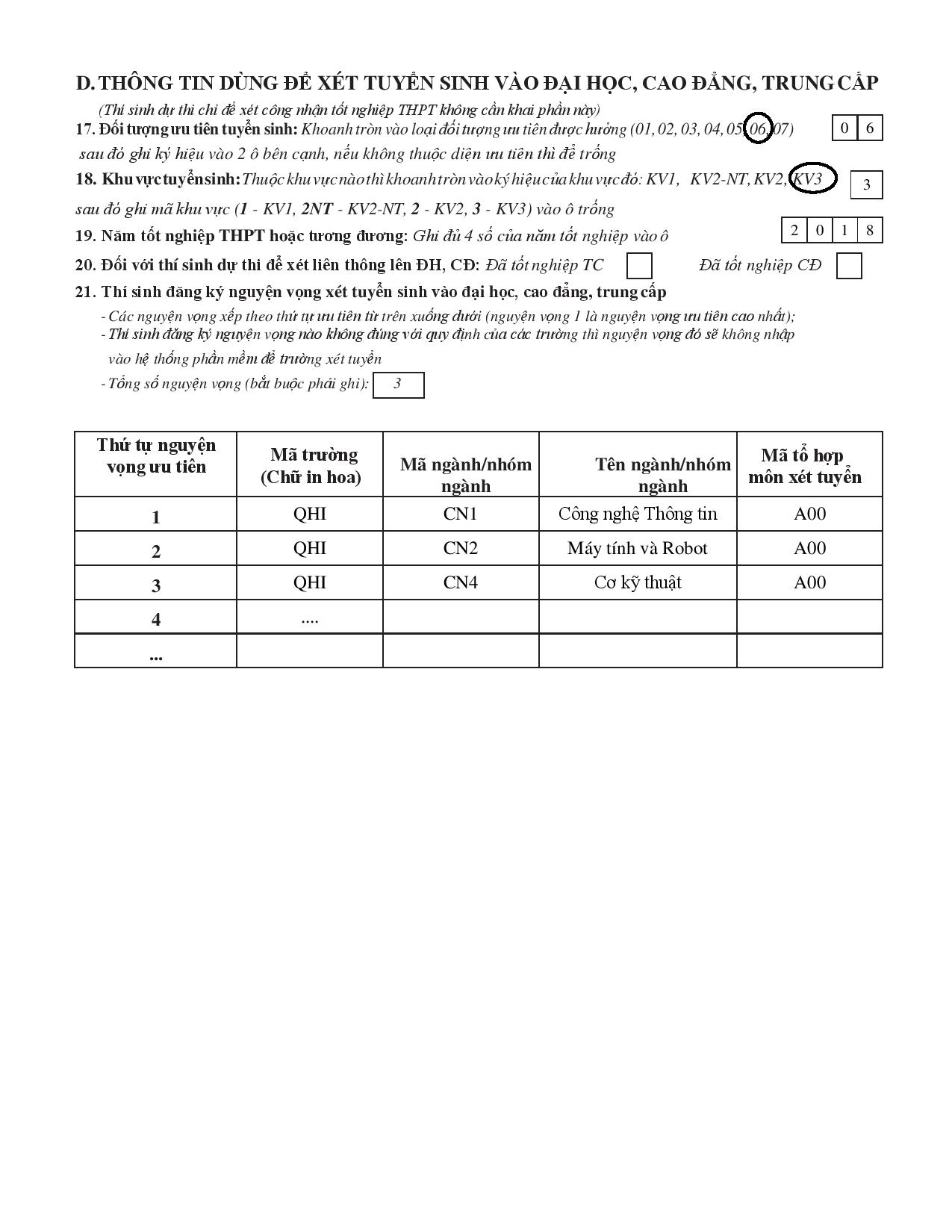 *. Mục 18: Đối với thí sinh dự thi có mục đích xét tuyển ĐH, CĐ cần ghi mã khu vực vào ô trống như sau: Khu vực 1 (KV1) điền chữ số 1, Khu vực 2 nông thôn (KV2-NT) điền 2NT, Khu vực 2 (KV2) điền chữ số 2, Khu vực 3 (KV3) điền chữ số 3. Trong 3 năm học THPT hoặc tương đương, học ở đâu lâu hơn hưởng ưu tiên khu vực ở đó.