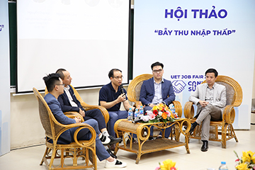 Phần giao lưu và chia sẻ kinh nghiệm của các diễn giả là những cựu sinh viên của Trường ĐH Công nghệ đã thu hút được sự quan tâm của sinh viên. Trong phần này, các diễn giả đã cắt nghĩa thế nào là bẫy thu nhập thấp và cách để có thể vượt qua, định hướng cho sinh viên những hướng đi đúng đắn và nắm bắt được cơ hội nghề nghiệp tương lai. Qua phần giao lưu, anh Phan Hà Trung – Phó Tổng giám đốc Ericsson Vietnam, cựu sinh viên K41; anh Trần Thế Anh – Tổng giám đốc Công ty Cổ phần Thương mại Dịch vụ DZ Group, cựu sinh viên K60; anh Nguyễn Chí Công – Phó Giám đốc Công ty Cổ phần AHT Tech, cựu sinh viên K51 đã chia sẻ những kinh nghiệm hữu ích để làm bản thân “khác biệt” trong quá trình tuyển dụng. Sinh viên có một nền tảng kiến thức tốt, tích lũy kỹ năng khi còn ngồi trên ghế giảng đường là hành trang giúp sinh viên tự tin trong quá trình tuyển dụng. Hơn nữa ngoại ngữ và chứng chỉ quốc tế là một lợi thế giúp sinh viên có nhiều cơ hội làm việc làm, “điểm sáng” đối với các nhà tuyển dụng.