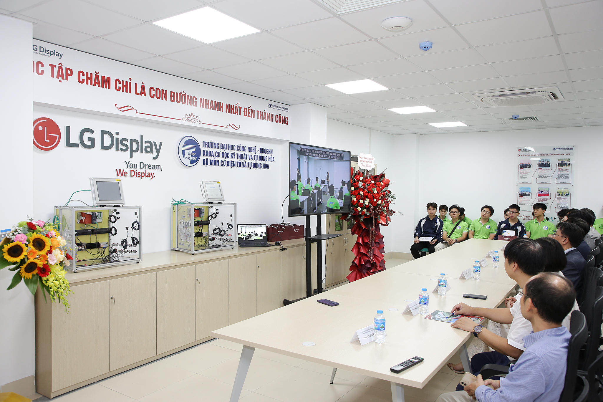 Nằm trong khuôn khổ hợp tác giữa hai bên, sự ra đời của phòng thí nghiệm (PTN) Công nghệ màn hình tiên tiến đã đánh dấu bước ngoặt quan trọng trong việc đẩy mạnh hợp tác giữa hai bên. Nhằm giúp sinh viên có môi trường học tập, thực hành ý tưởng và tiếp cận, làm quen với môi trường tiên tiến nhất trong lĩnh vực tự động hóa và công nghệ màn hình, LGDVH đã tài trợ cho Trường ĐH Công nghệ PTN Công nghệ màn hình tiên tiến với trang thiết bị hiện đại bao gồm 1 bộ robot kit gồm 2 cánh tay, 1 máy nén khí… cùng toàn bộ nội thất mới.