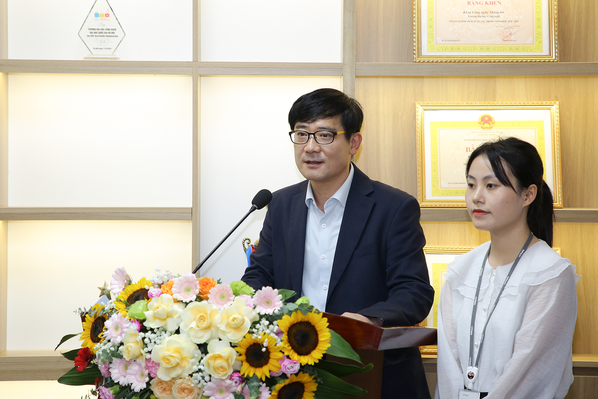 Tại buổi lễ, ông Choi In Kwan – Tổng giám đốc LGDVH đã bày tỏ sự vui mừng khi tham dự sự kiện quan trọng của LGDVH và UET. Đồng thời chính sự quyết tâm và nhiệt huyết của giảng viên, sinh viên UET đã đem lại những kết quả tốt đẹp cho sự hợp tác của hai bên. Giới thiệu về LGDVH, ông Choi In Kwan khẳng định về tầm quan trọng của việc đào tạo nhân tài và ươm mầm tài năng là một trong những yếu tố góp phần phát triển LGDVH trở thành công ty sử dụng công nghệ màn hình tiên tiến mới nhất hiện nay. Chương trình hợp tác với UET là cơ hội quan trọng để LGDVH kết nối với các sinh viên ưu tú, từ đó hai bên sẽ có sự tin tưởng và sinh viên UET sẽ yêu thích, gắn bó với LG.