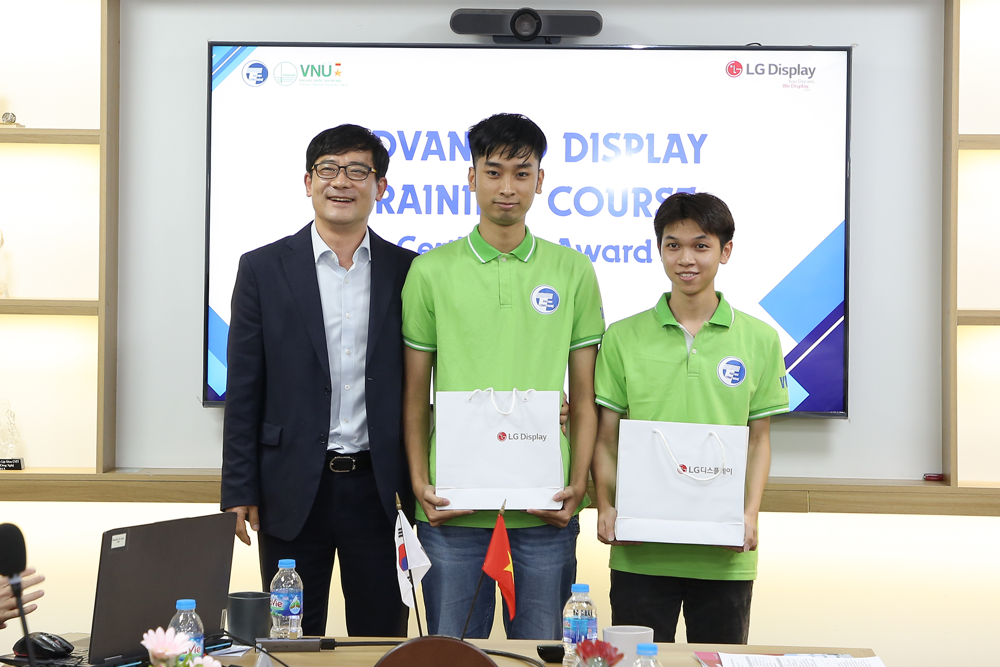 Ông Choi In Kwan – Tổng Giám đốc LGDVH vinh danh sinh viên Vũ Quang Hưng (ngoài cùng, bên phải ảnh), Trần Nam Trung (ở giữa) có kết quả học tập xuất sắc nhất tại khóa học