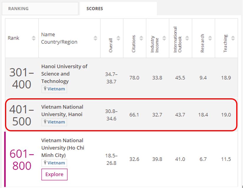 Ngày 11/9/2019, Thời báo Giáo dục ĐH (Times Higher Education, THE) công bố kết quả xếp hạng ĐH thế giới mới nhất (World University Rankings 2020) trong sự kiện Hội nghị Thượng đỉnh về học thuật của THE tổ chức tại Zurich (Thụy Sỹ). Theo đó, lần đầu tiên ĐH Quốc gia Hà Nội (ĐHQGHN) và 02 cơ sở giáo dục ĐH của Việt Nam được THE công bố thứ hạng cùng với gần 1.400 cơ sở giáo dục ĐH hàng đầu thế giới. Trong đó, ĐHQGHN cùng Trường ĐH Bách khoa Hà Nội thuộc nhóm 801-1000 thế giới; tiếp theo là ĐH Quốc gia Thành phố Hồ Chí Minh trong nhóm 1000+.
