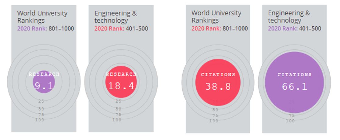 So với mặt bằng chung trong kết quả xếp hạng ĐH thế giới THE WUR 2020, lĩnh vực Kỹ thuật & Công nghệ được đánh giá cao về nhóm tiêu chí Nghiên cứu (Research) có số điểm gấp 2.1 lần (18.4 so với 9.1) và nhóm tiêu chí Số trích dẫn (Citation) có số điểm gấp 1.7 lần (66.1 so với 38.8) so với mức trung bình của ĐHQGHN. Các nhóm tiêu chí khác về Giảng dạy (Teaching), Thu nhập từ doanh nghiệp (Industry Income), Quốc tế hóa (International Outlook) có mức điểm tương đương với mức trung bình của ĐHQGHN.