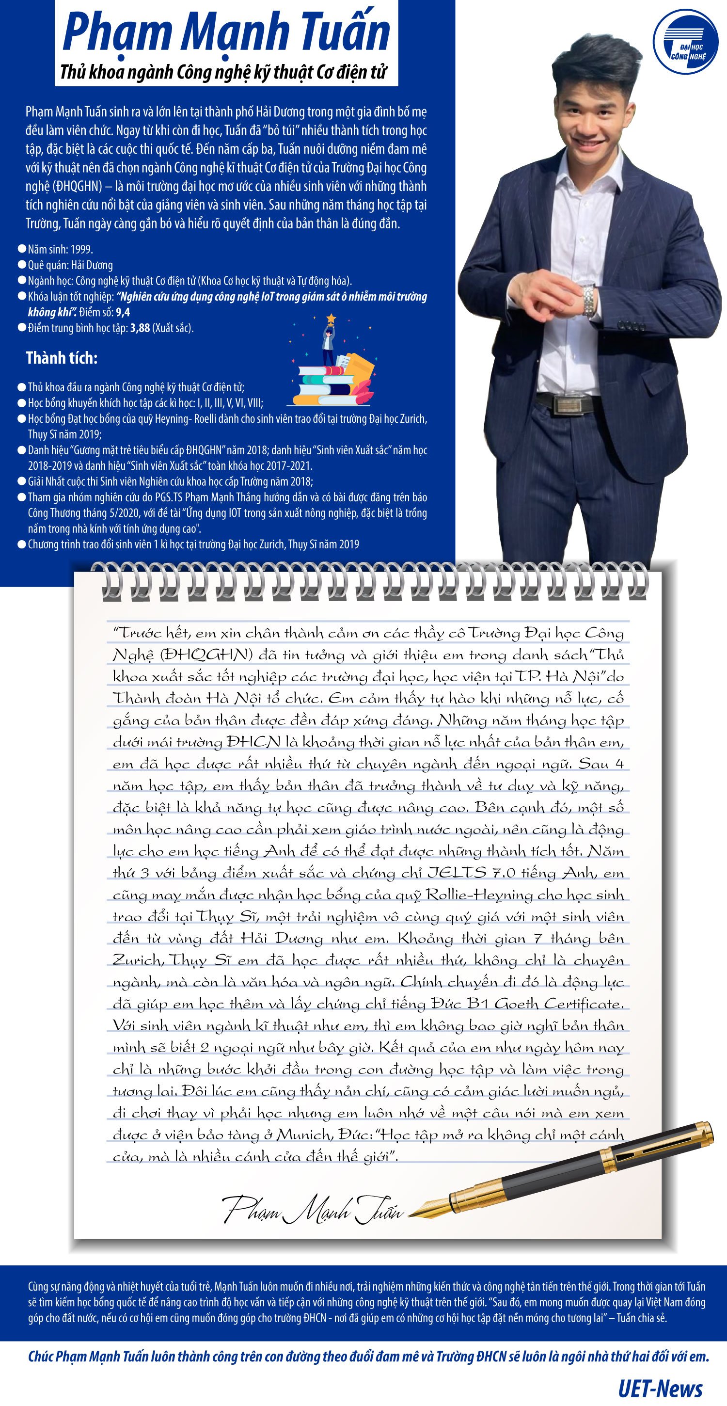 Trong số các sinh viên Trường Đại học Công nghệ (Đại học Quốc gia Hà Nội) nhận bằng tốt nghiệp cử nhân năm 2021 có nhiều gương mặt là thủ khoa các ngành được vinh danh. Trong đó, Phạm Mạnh Tuấn là một trong những gương mặt có thành tích xuất sắc trong học tập, nghiên cứu khoa học, đồng thời là thủ khoa được vinh danh tại chương trình “Thủ khoa xuất sắc tốt nghiệp các trường đại học, học viện tại TP. Hà Nội” do Thành đoàn Hà Nội tổ chức.